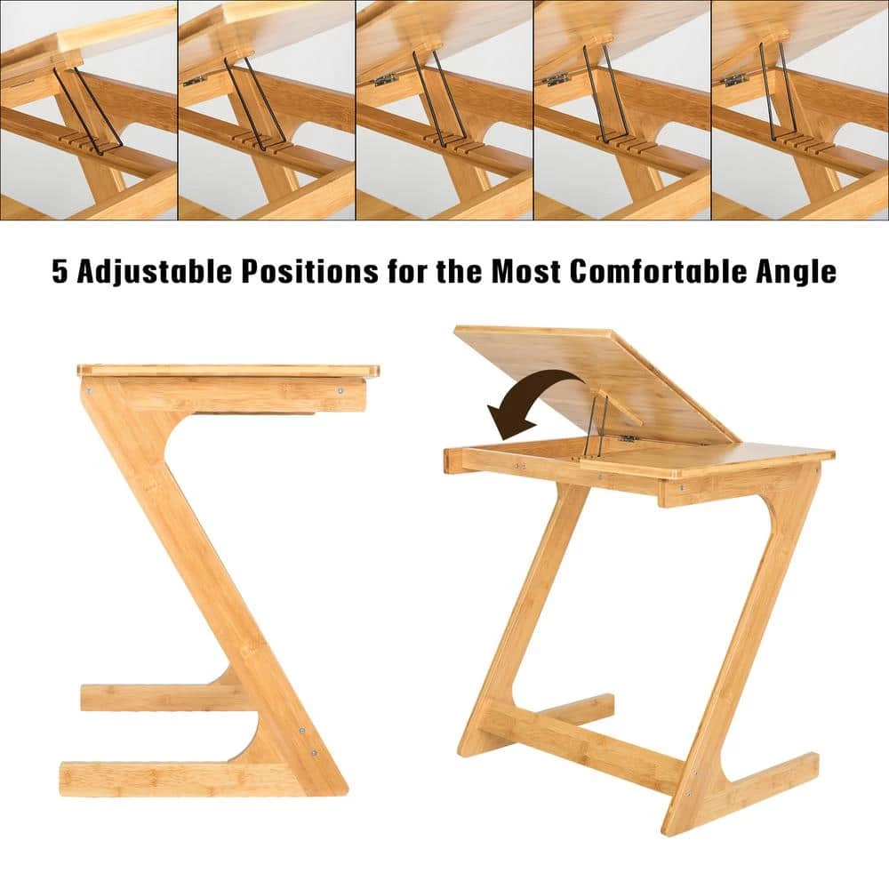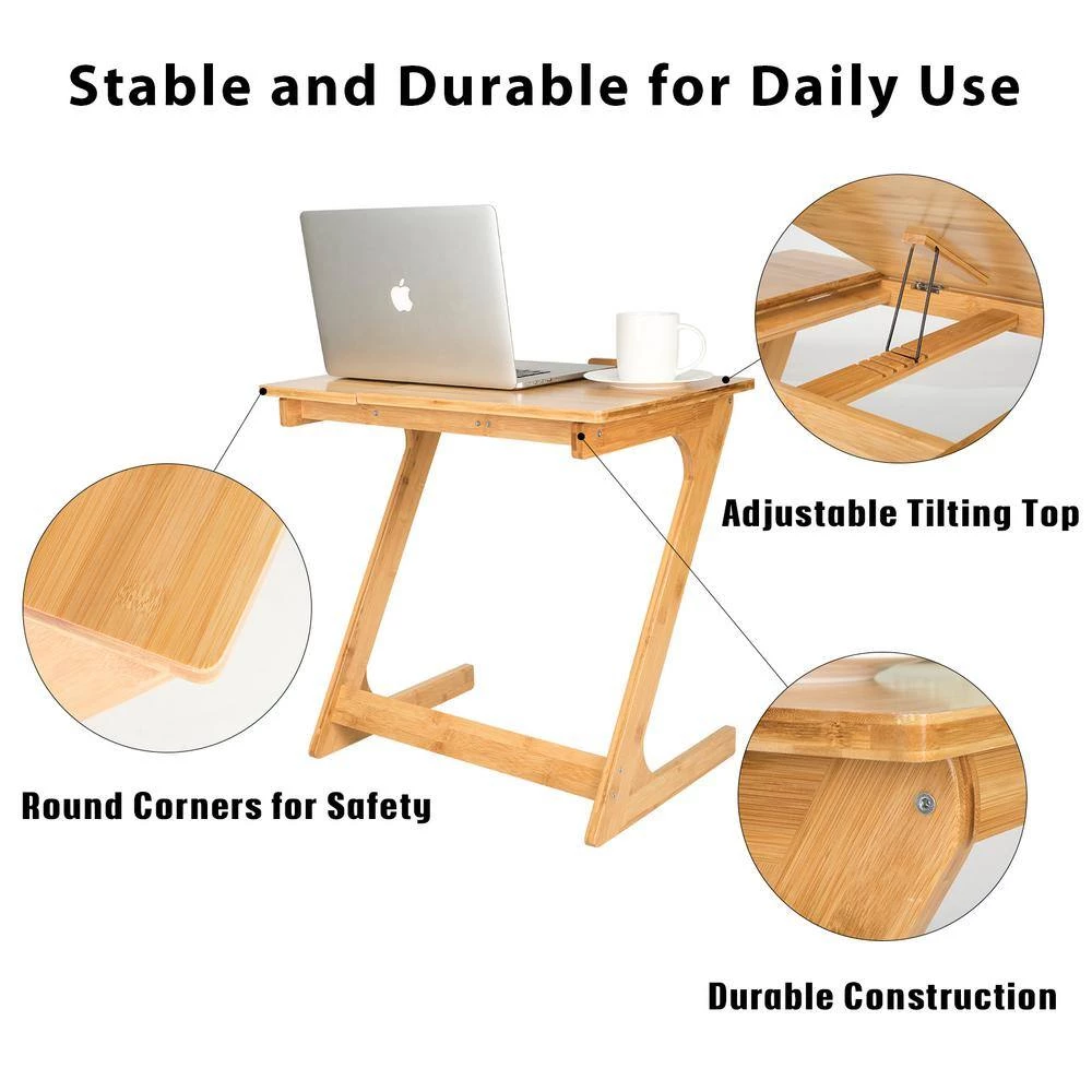 Using this Z-shaped side table can help you enrich your daily life, this is an adjustable side table, unique 5 adjustable slots can be adjusted into 5 positions according to your different needs, which will prevent neck fatigue and eye fatigue . And a removable baffle for preventing laptop sliding off when the top is adjusted obliquely. And its material is made of 100% natural bamboo, so it is not easy to corrode or damage. In terms of design, it is fully in line with the aesthetics of modern people and is very in line with the trend of the times. With it, I believe it can add an elegant and fashionable atmosphere to your home. It is very convenient and practical, and it is very light, you can put it in any place of the house without being obtrusive.This side table is design in concise and modern style, which will match well with your home decor. Because of the compact size and smart function, our end table is a perfect solution to be placed in bedroom, living room, study or office as a side table or laptop table.