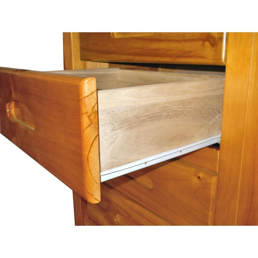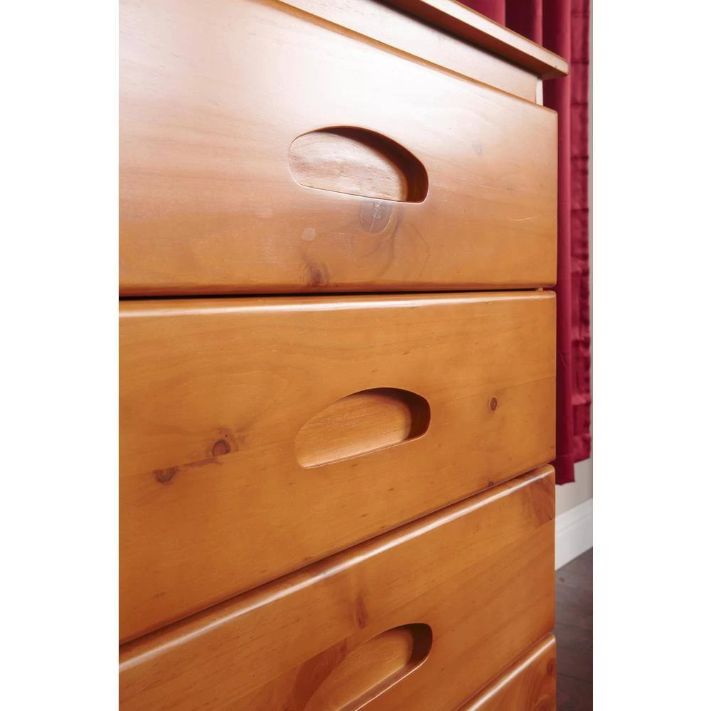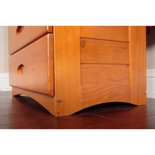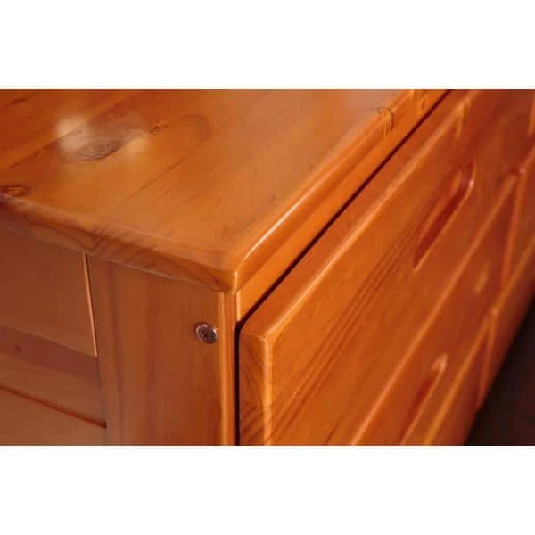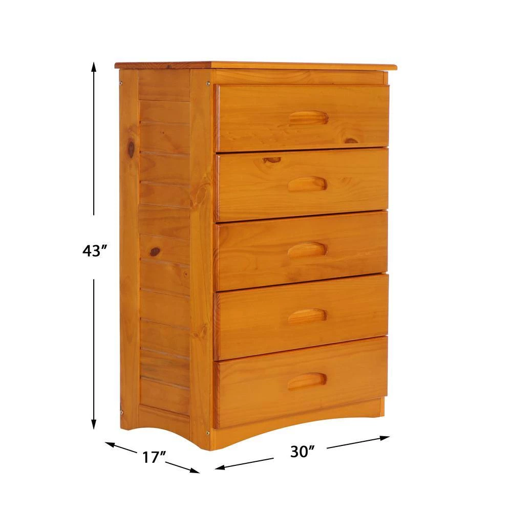 This sturdily constructed solid wood warm honey stained five drawer chest will give you years of service. The item ships ready to assemble and features unique, framed side panels and striking brushed silver finish on the drawers. The drawers operate on smooth running nylon rollers attached to metal guides.