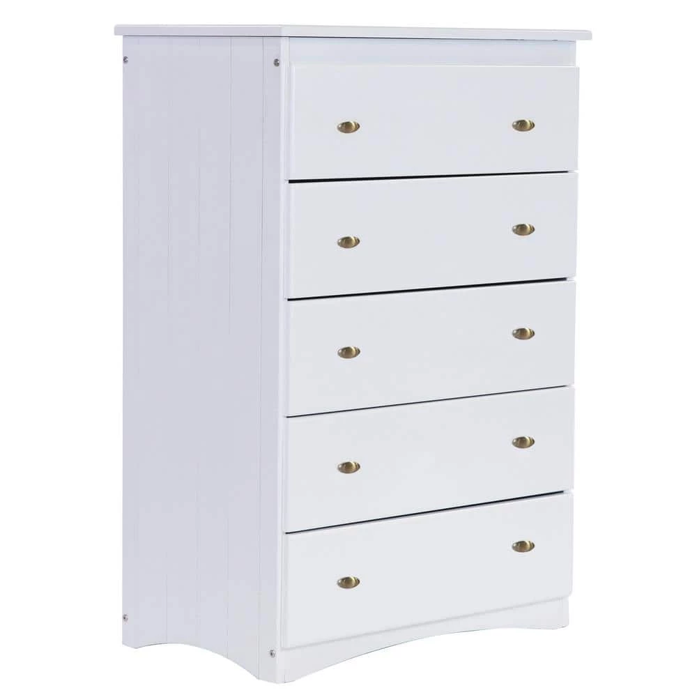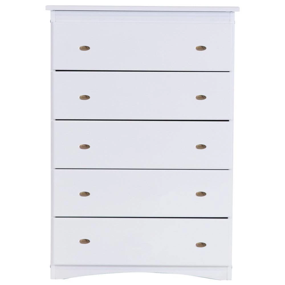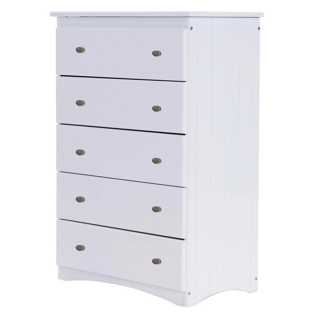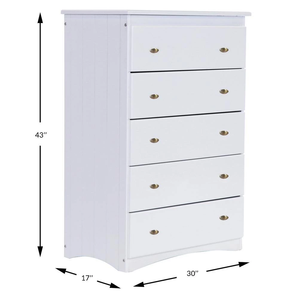 This sturdily constructed solid wood white painted five drawer chest will give you years of service. The item ships ready to assemble and features unique, framed side panels and striking brushed silver finish on the drawers. The drawers operate smoothly on nylon rollers attached to metal guides.