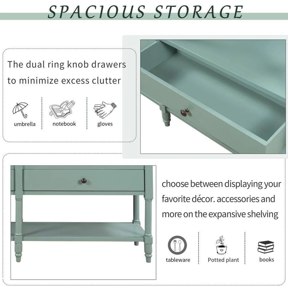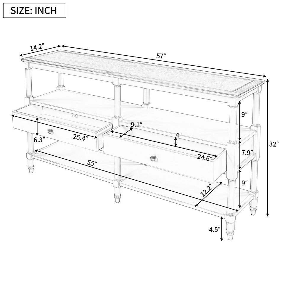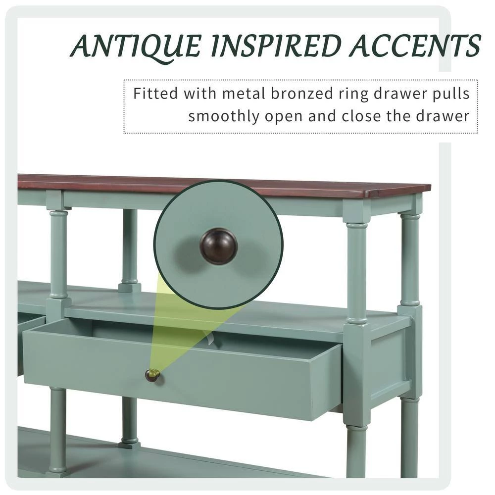 A hallmark antique style, streamlined silhouette and weathered finish make this elegant console a must-have-piece for your living room, hallway or dining room with its versatile nature.Tabletop weight capacity: 155 lbs.; Shelf weight capacity: 88 lbs.; Single-drawer weight capacity: 55 lbs. accessories and more on the expansive shelving or neatly tucking it away in the dual ring knob-drawers to minimize excess clutter.you deserve to have.