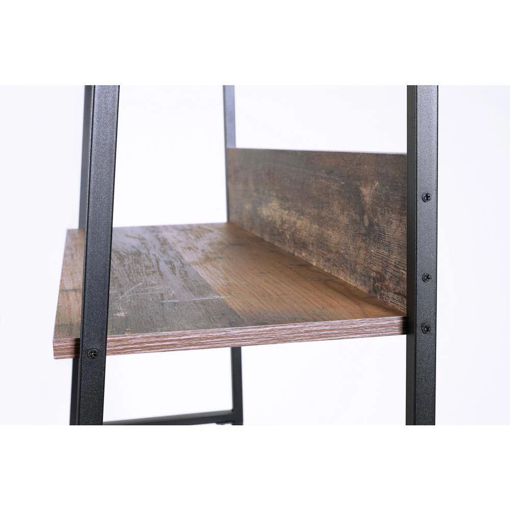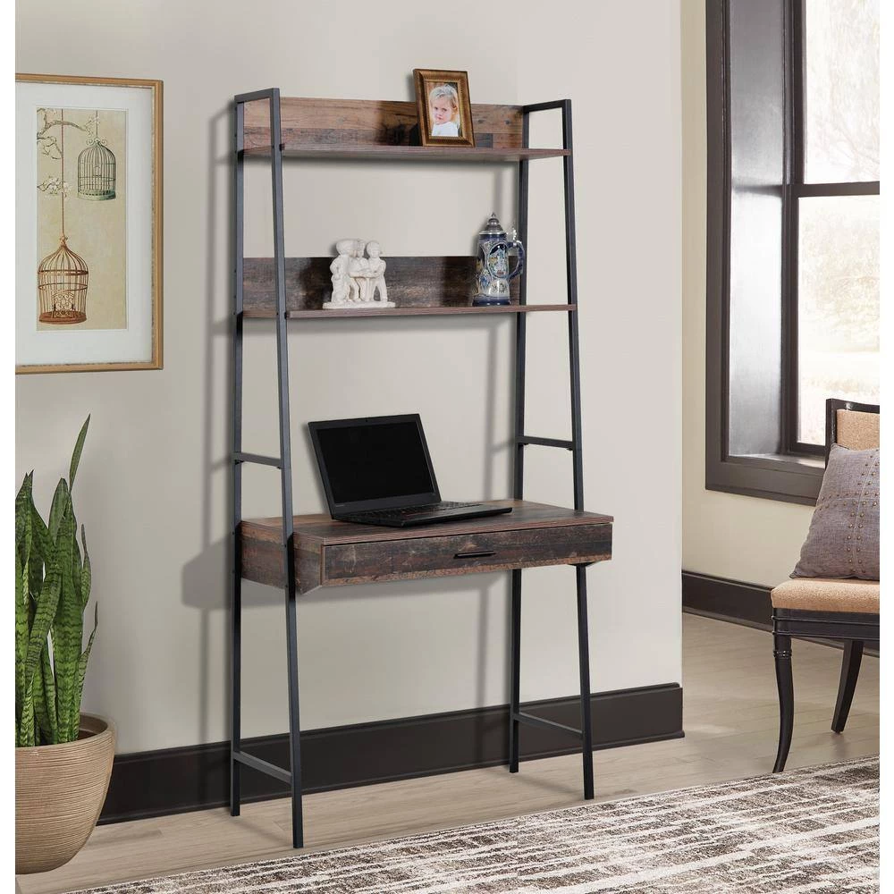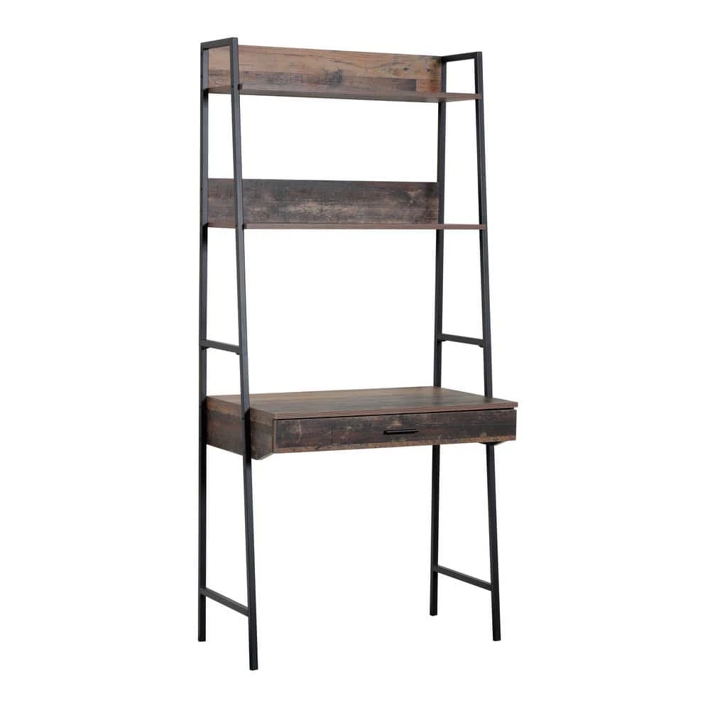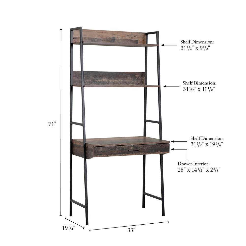 Provide interesting and functional style to your home with this 3-shelf ladder style bookcase with desk. Popular ladder look with sturdy powder coated metal legs with dramatic Rustic Reclaimed Barnwood laminate. Nice large worksurface and spacious pull out drawer on sturdy metal guides. Pair this item with our model 41105 ladder style bookcase to create a dramatic look.