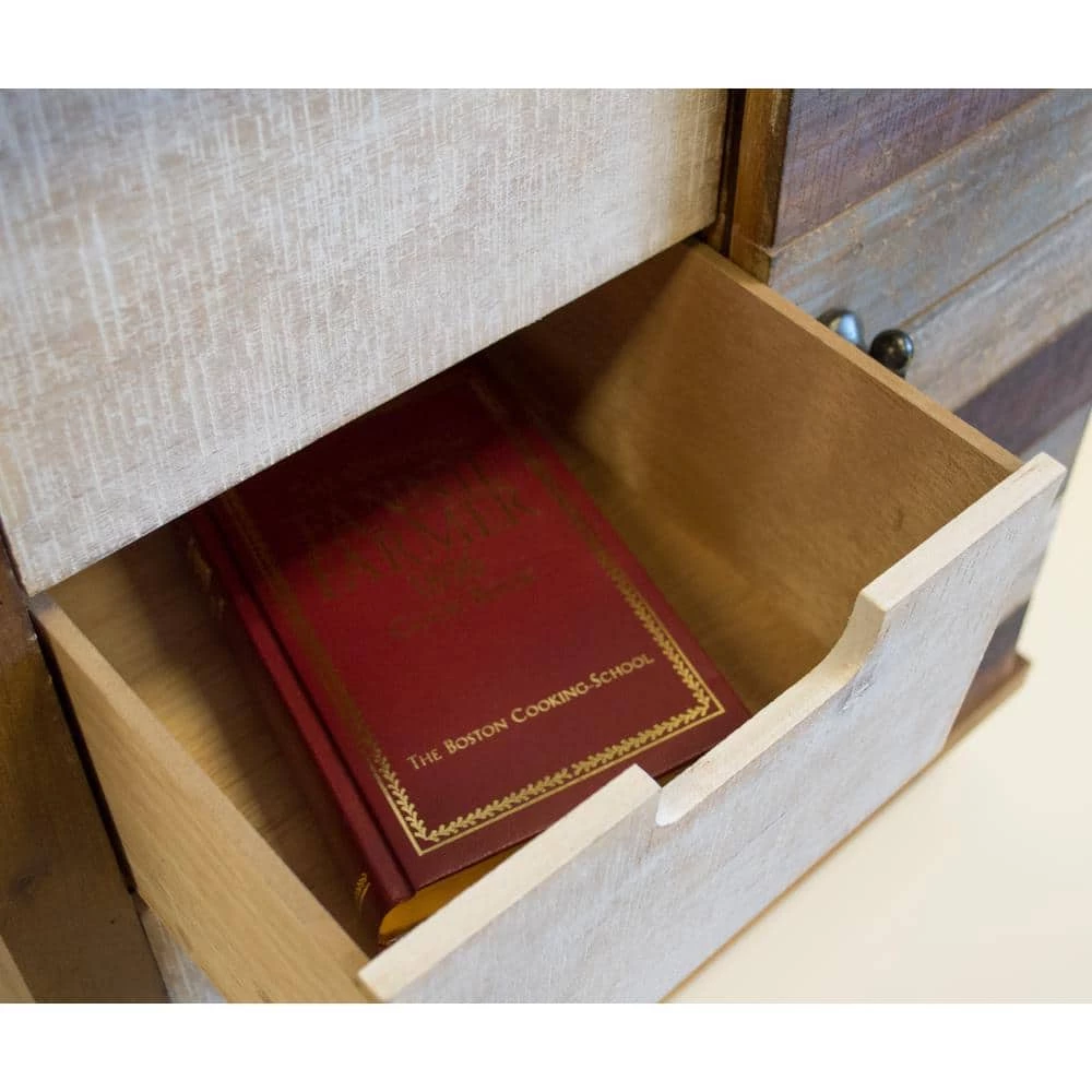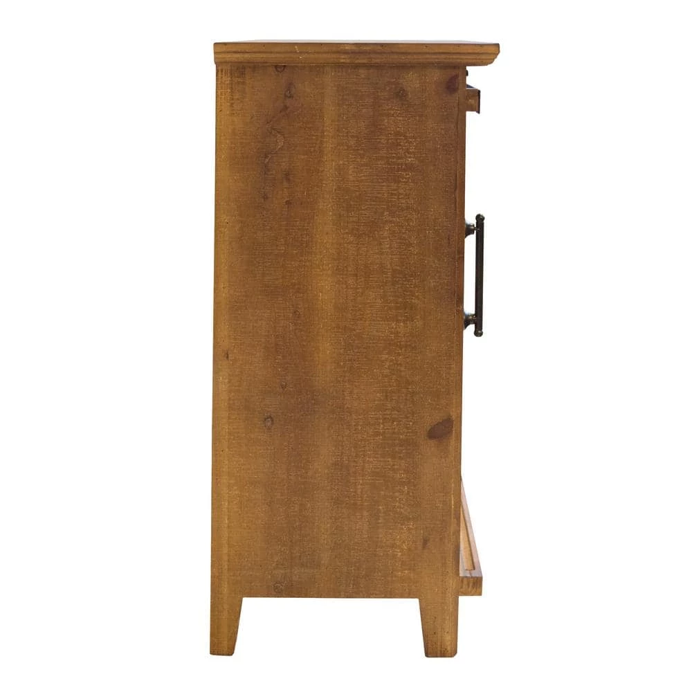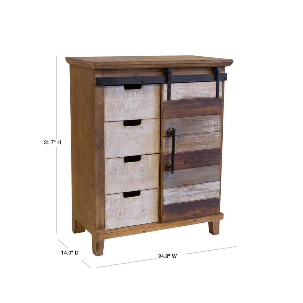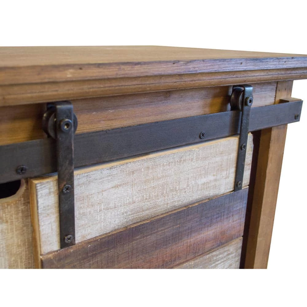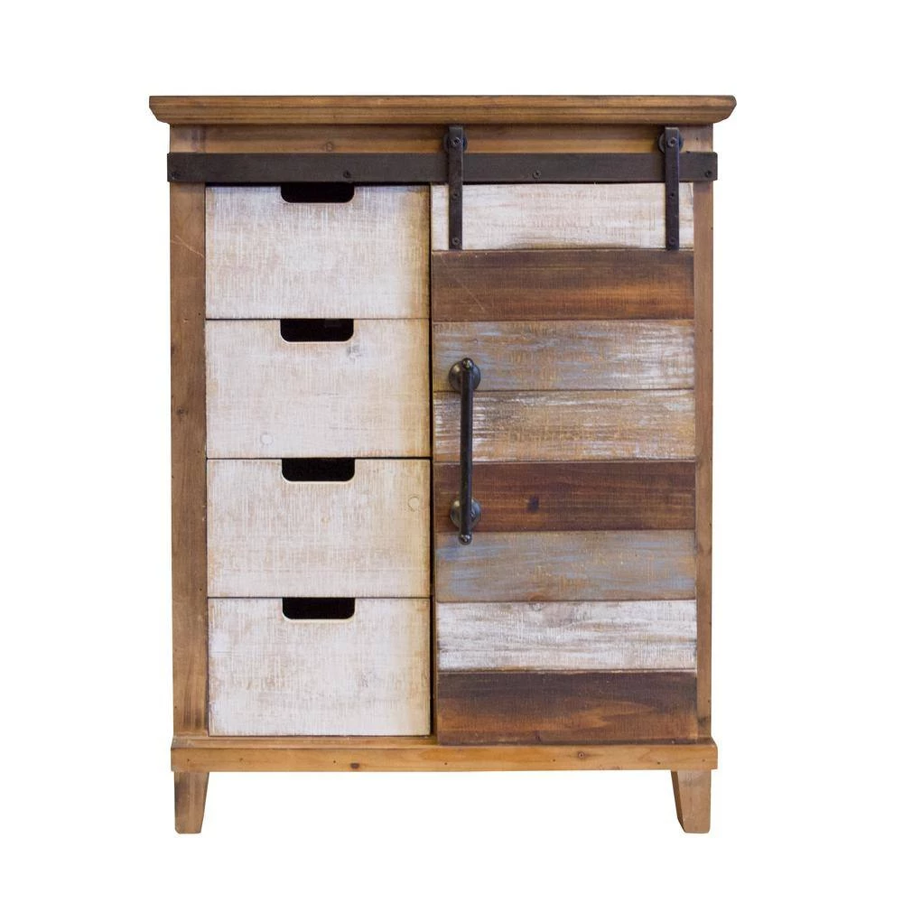 This is a great accent storage item for you kitchen or family room. Features a fashionable barn style sliding door on sturdy metal wheels, four drawer bins and two shelves. Solid wood with multiple distressed finishes.