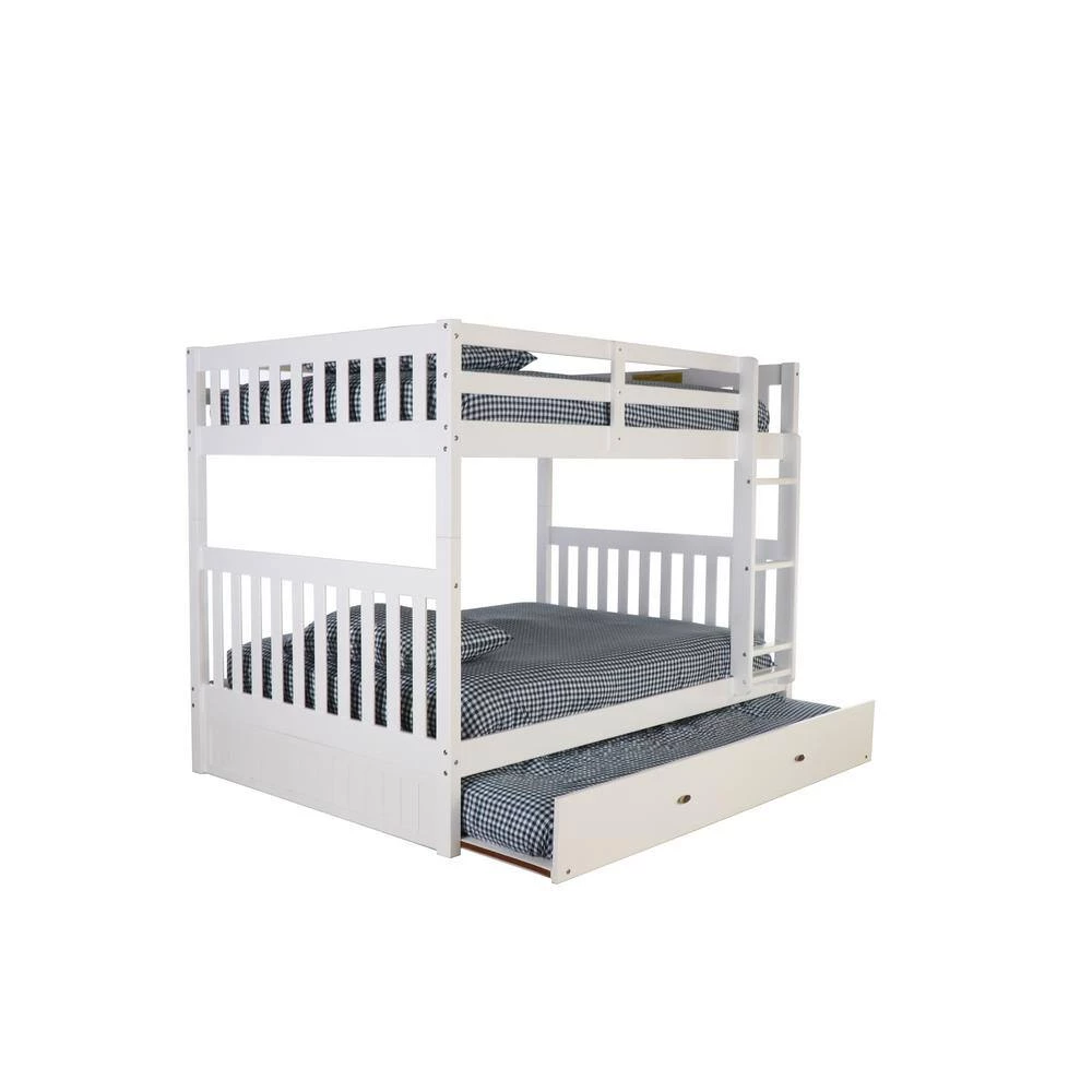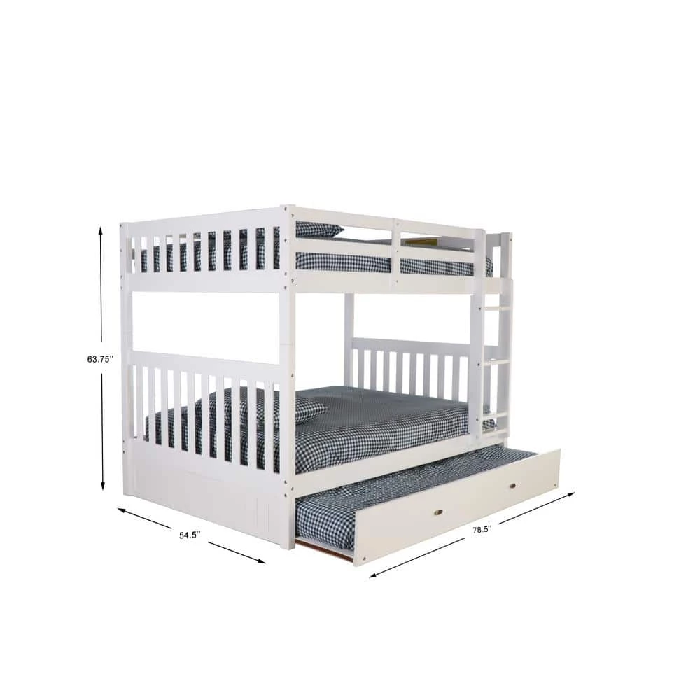 This full over full size bunk bed in a casual white finish provides plenty of sleeping area and storage while taking up very little space. This unit is constructed of solid wood and is ready to assemble. In the event of a sleep over there is also a solid pull out twin trundle on sturdy casters.