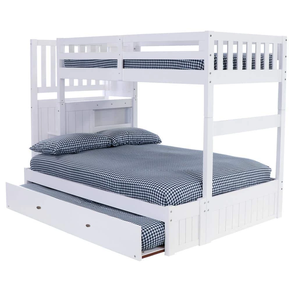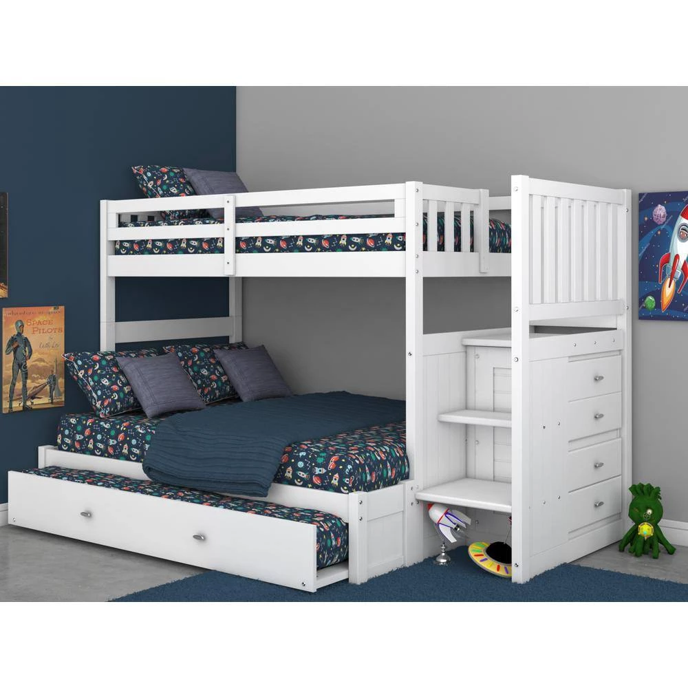 .Add style to your children’s bedroom with this twin over full staircase bunk bed in a casual white finish. The ready-to-assemble unit features a built-in, four-drawer chest and reversible staircase, magazine rack, and a twin sized trundle unit on sturdy casters. The stair treads are 17.25 in. wide for a safe climb to the upper bunk. Quality, solid-wood construction makes this bunk bed a great buy.
