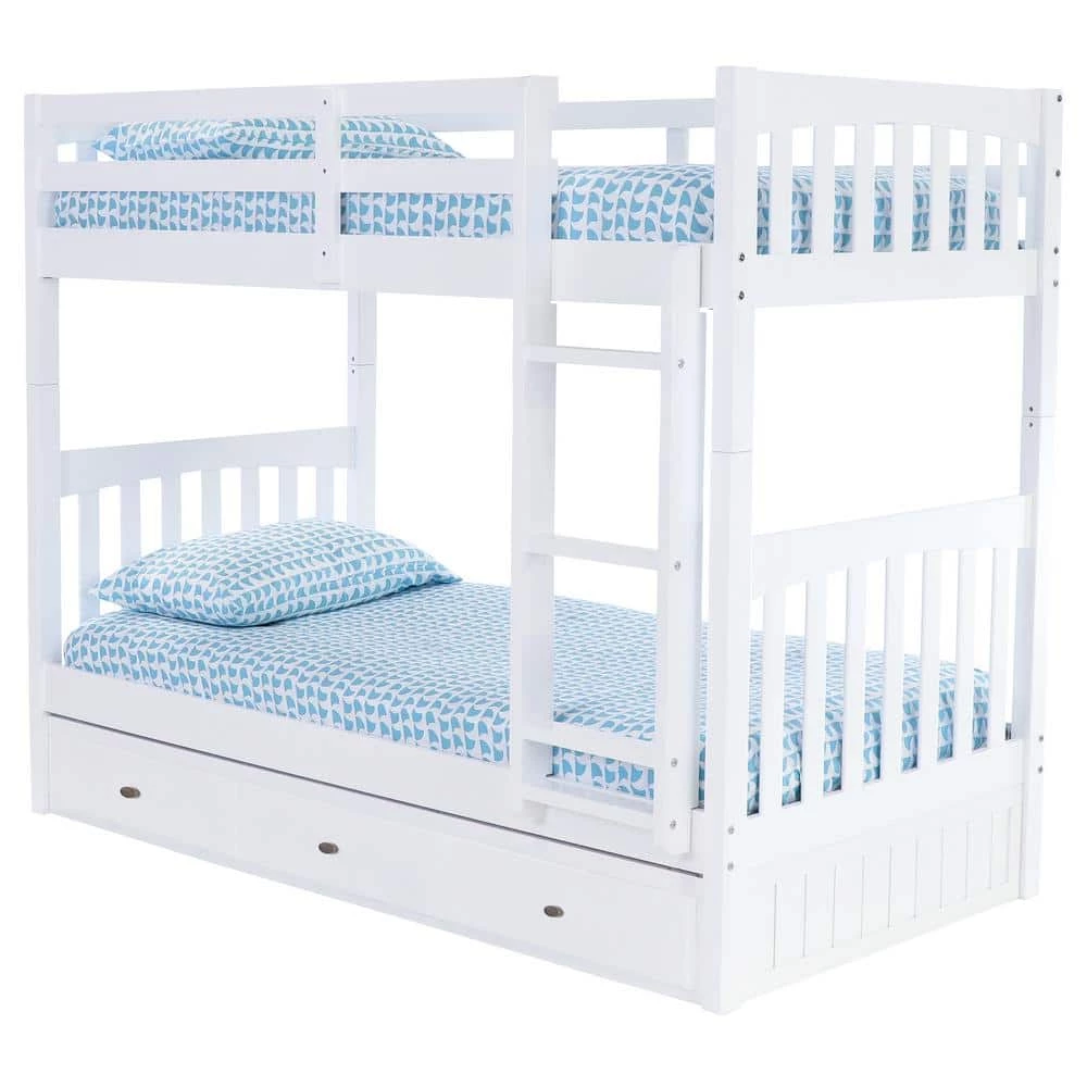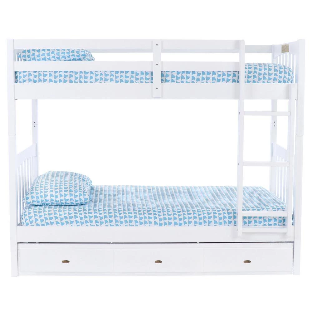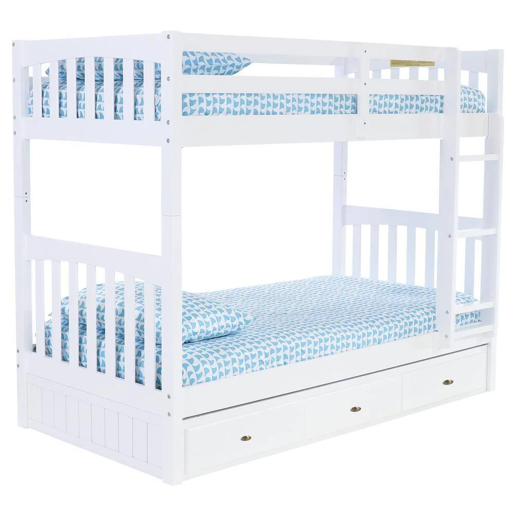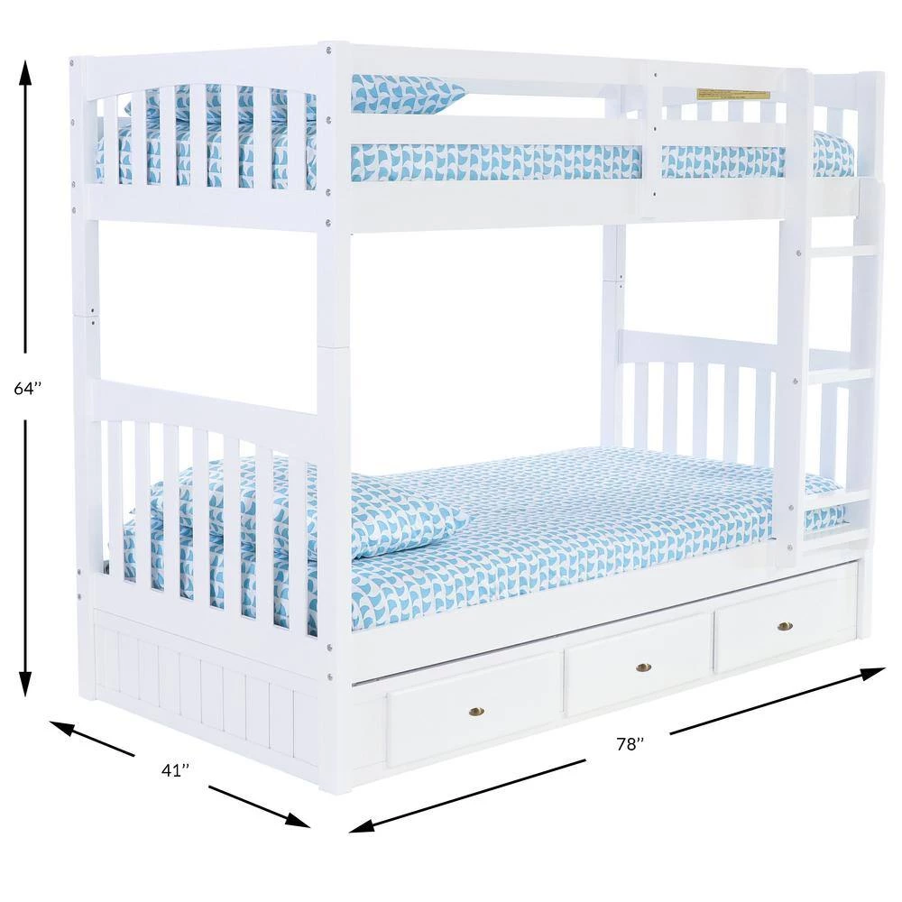 This twin over twin size bunk bed in a casual white finish provides plenty of sleeping area and storage while taking up very little space. This unit is constructed of solid wood and is ready to assemble. The 3-drawer under bed unit provides ample space for storage.