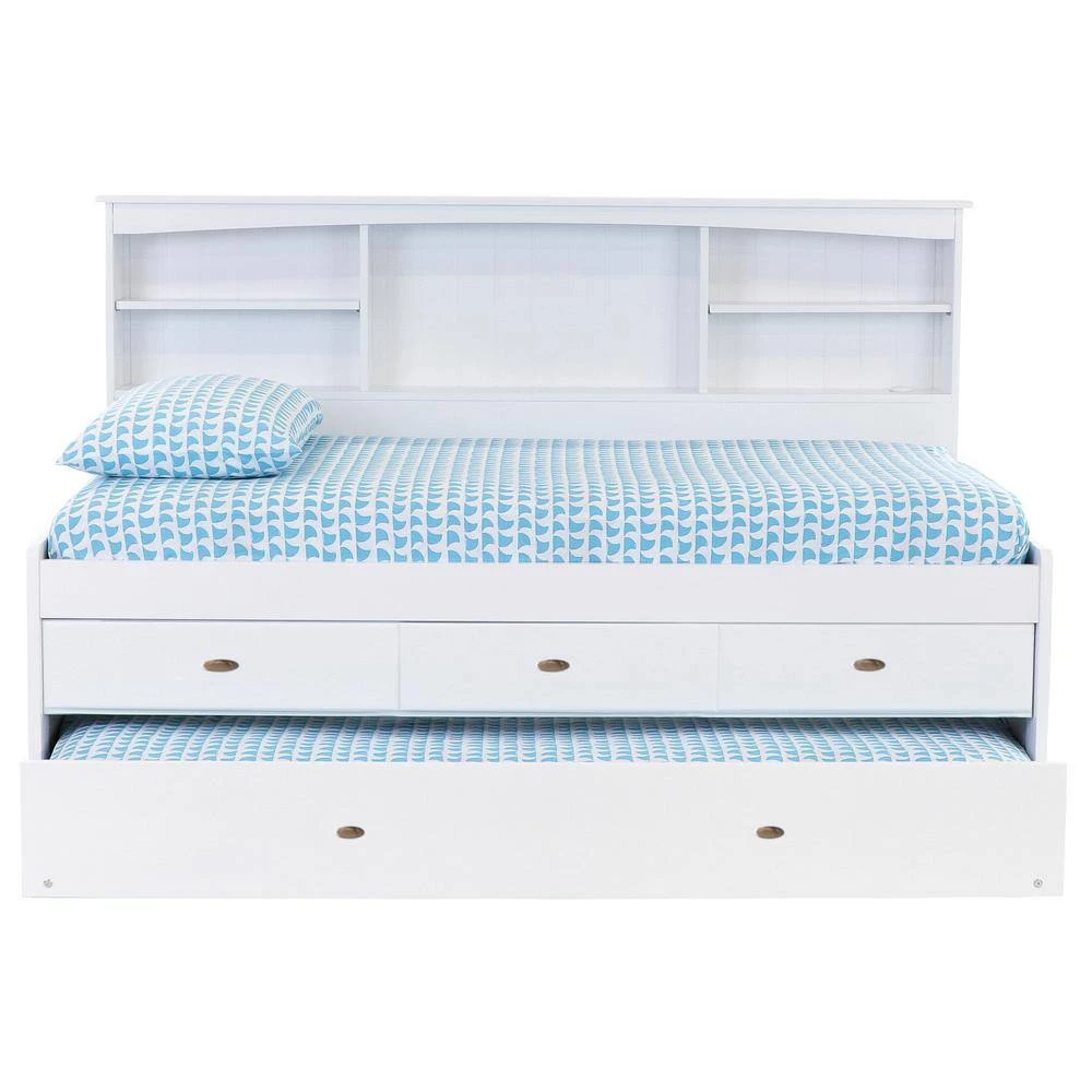 Add fashion and function to your child’s bedroom with this twin size bookcase daybed in a casual white finish. The ready-to-assemble unit provides loads of storage with the three drawer pedestal and underbed storage accessible from either end of the bed. The drawers come to you assembled and feature metal drawer guides and attractive pulls. Also included is a twin sized trundle bed for additional sleeping capacity. Quality and solid wood construction makes this captains bed a great purchase.
