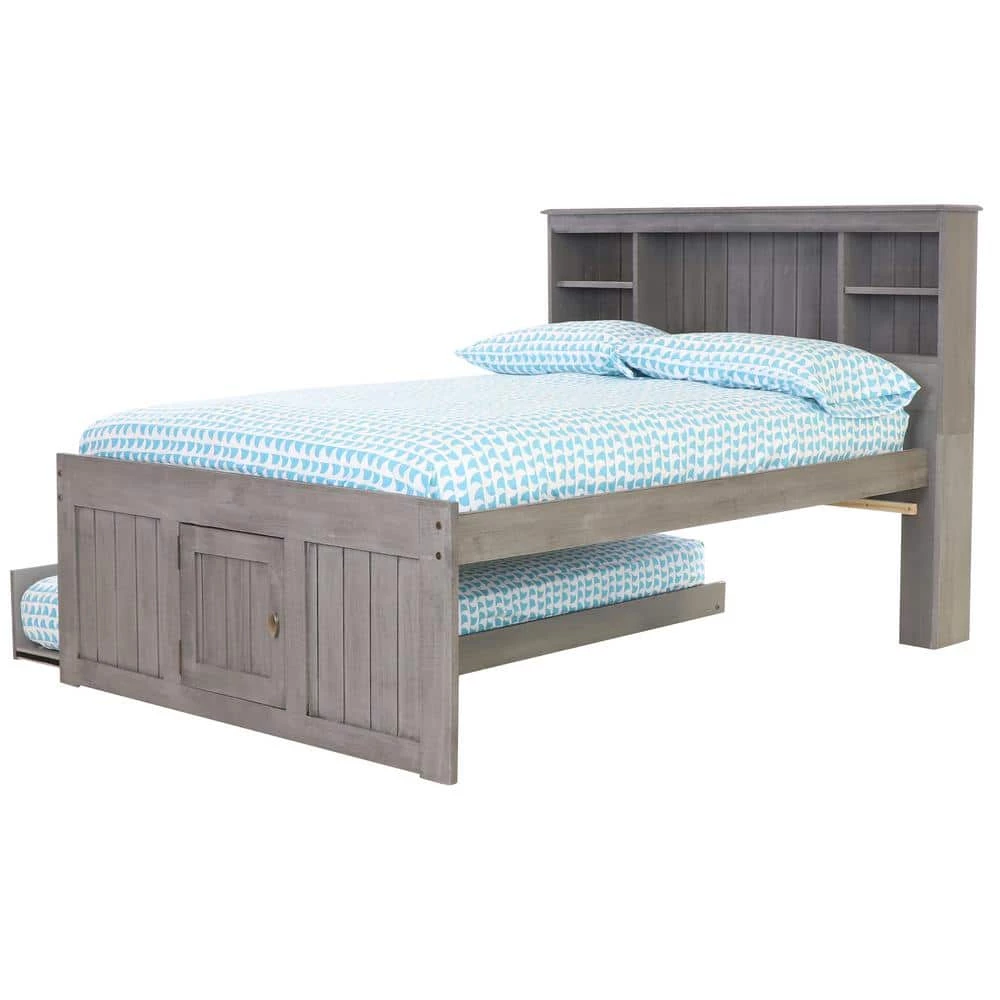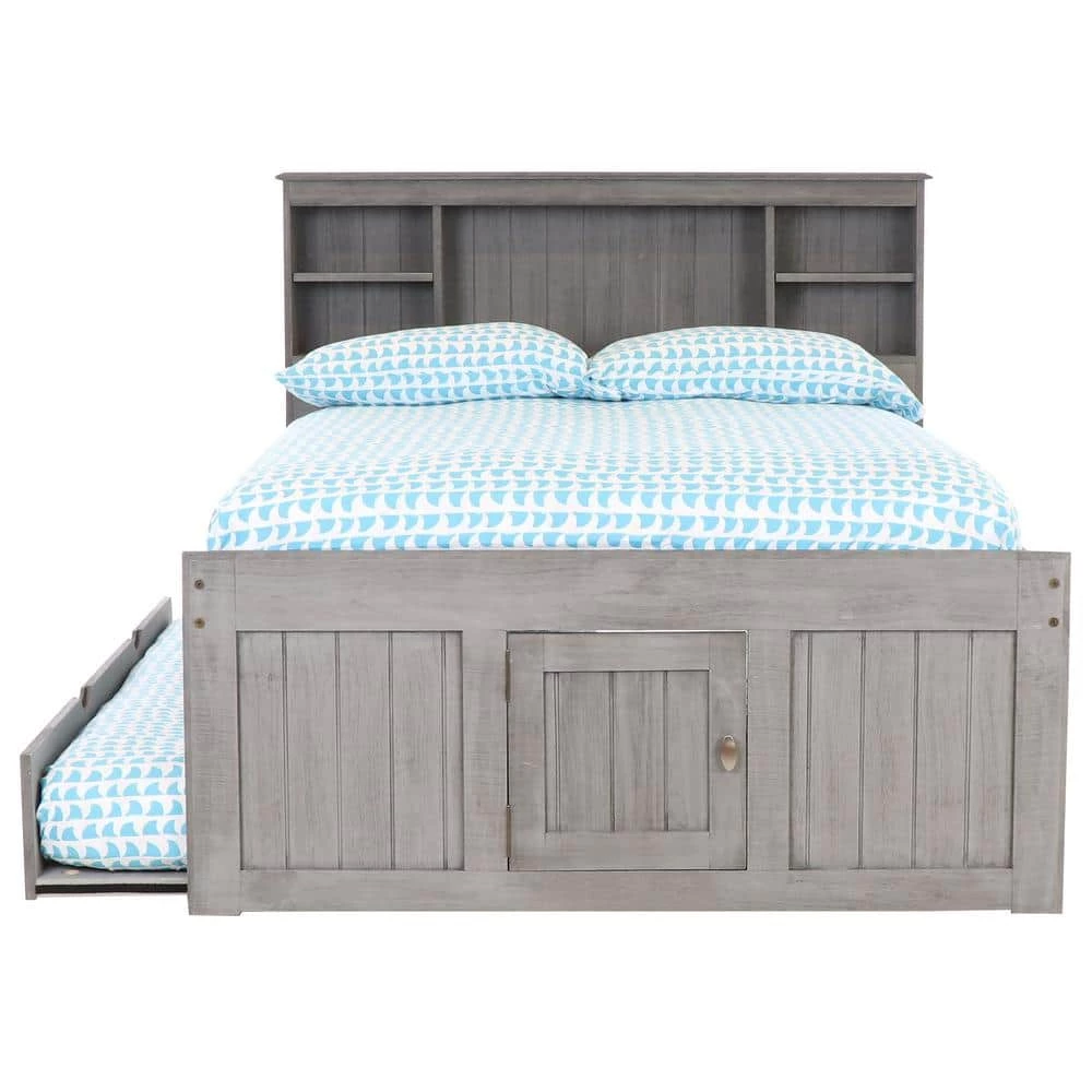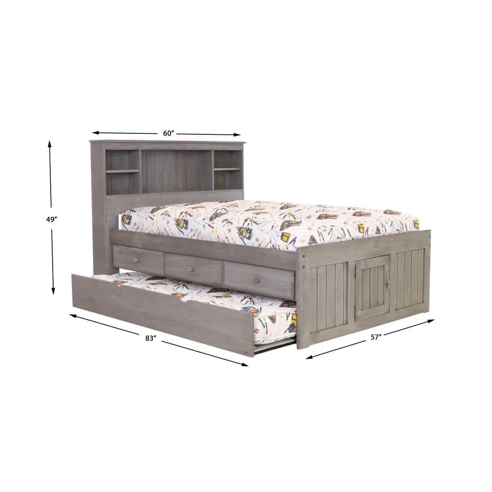 Add fashion and function to your child’s bedroom with this full size captains bookcase bed in a rich charcoal grey finish. The ready-to-assemble unit provides loads of storage with the 3-drawer pedestal and under bed storage accessible from either end of the bed. The drawers feature metal drawer guides and Striking brushed nickel pulls. Also included is a twin sized trundle bed for additional sleeping capacity. Quality and solid wood construction makes this captains bed a great purchase.