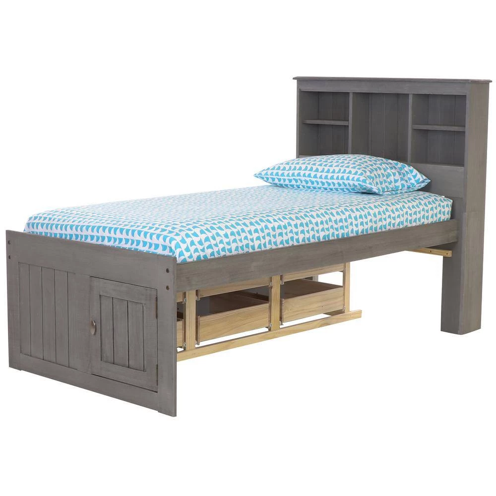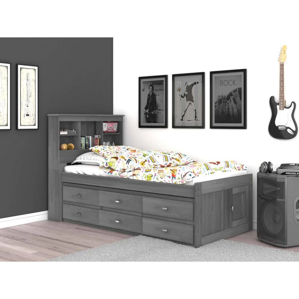 Add fashion and function to your child’s bedroom with this twin size captains bookcase bed in a rich charcoal grey finish. The ready-to-assemble unit provides loads of storage with the 6-drawer pedestal on each side for a total of 12-drawers. The drawers feature metal drawer guides and Striking brushed nickel pulls. Quality and solid wood construction makes this captains bed a great purchase.