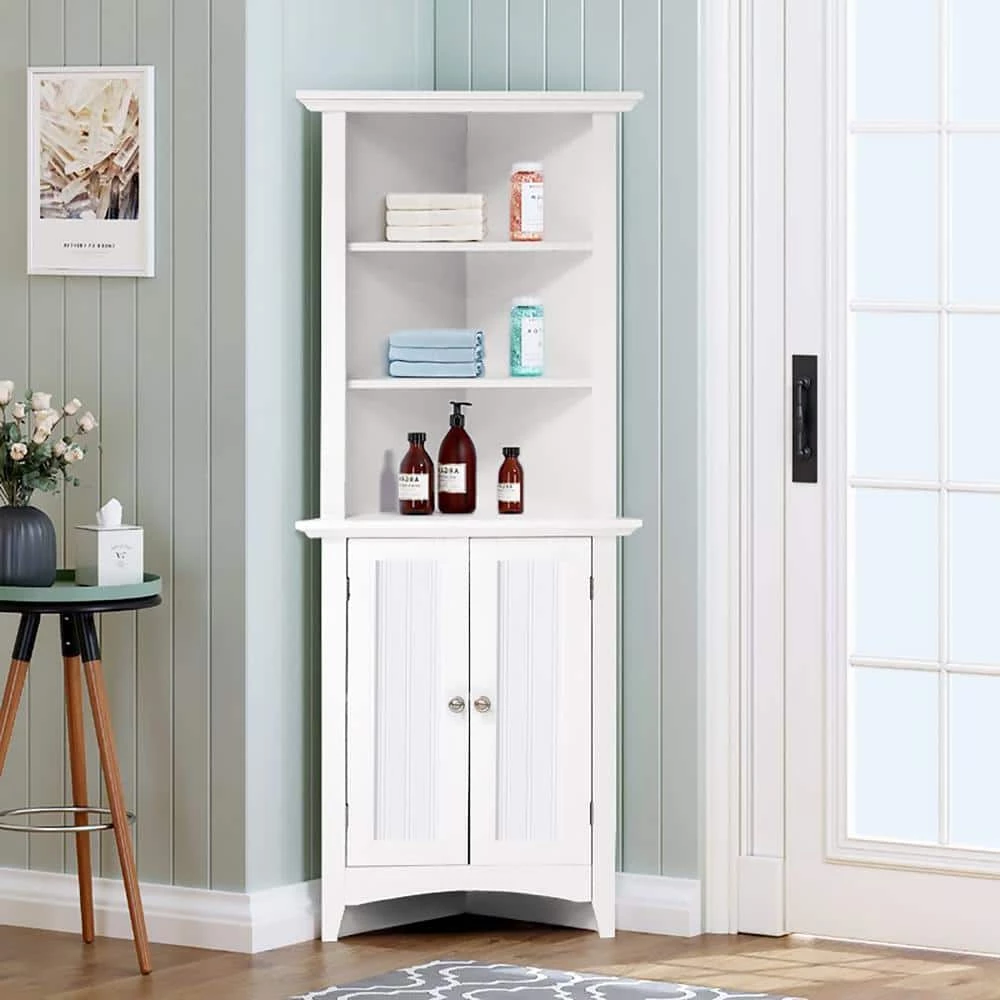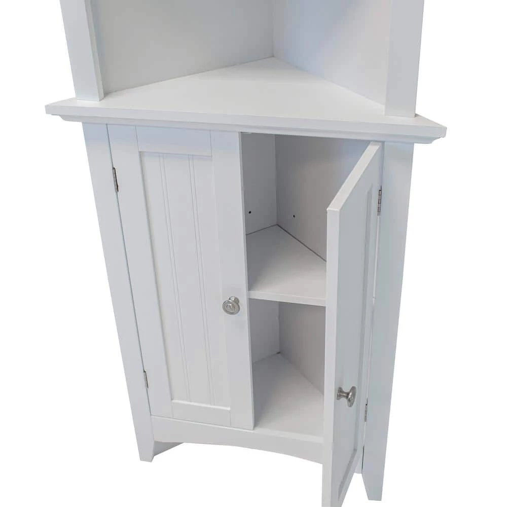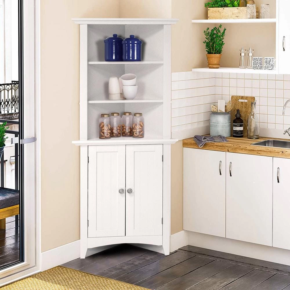 Classic white painted, raised panel doors highlight the OS Home and Office kitchen storage assortment. The 4 items; one door pantry, microwave station, corner cabinet, and buffet with hutch feature rich design and packs in lots of storage and function. Add much needed storage to your kitchen or bath with this truly functional corner cabinet. 2 raised panel doors for concealed storage accompany 3 shelves for added storage and or display space for your everyday kitchen or bath items. The corner design allows you to utilize space that may not be available with traditional cabinetry.
