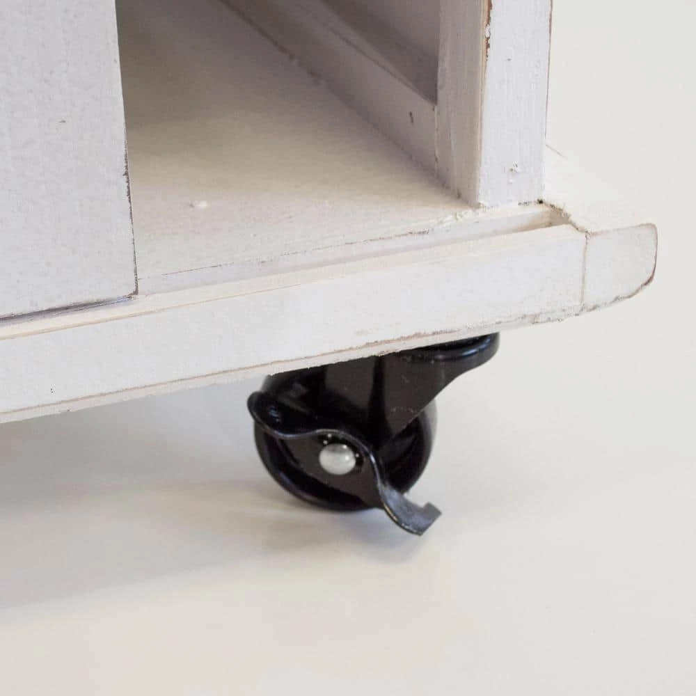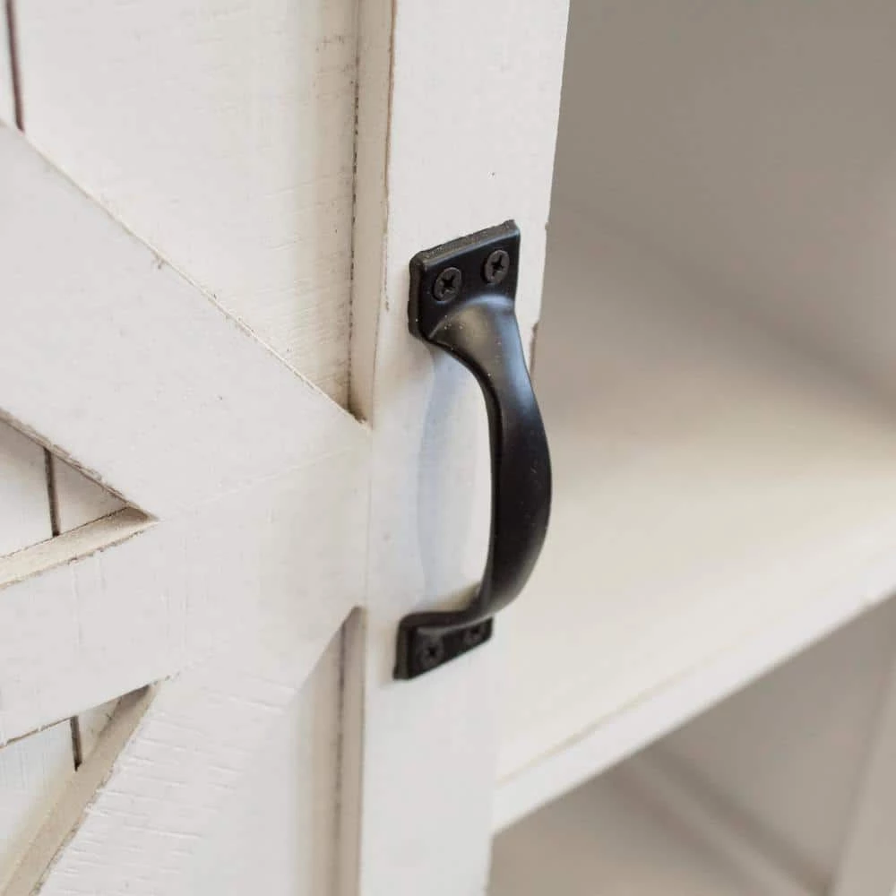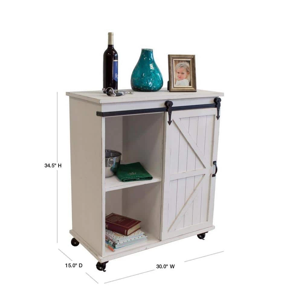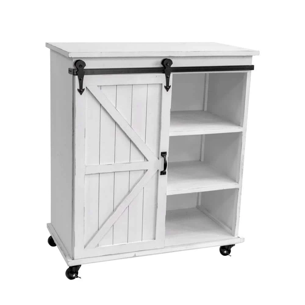 Combine style and function with this farm house styled multi use storage cabinet with sliding rustic barn door design. This will look great in your kitchen or other rooms in your home and features a distressed white finish on solid wood. Multi functional five fixed shelves and locking casters for mobility.