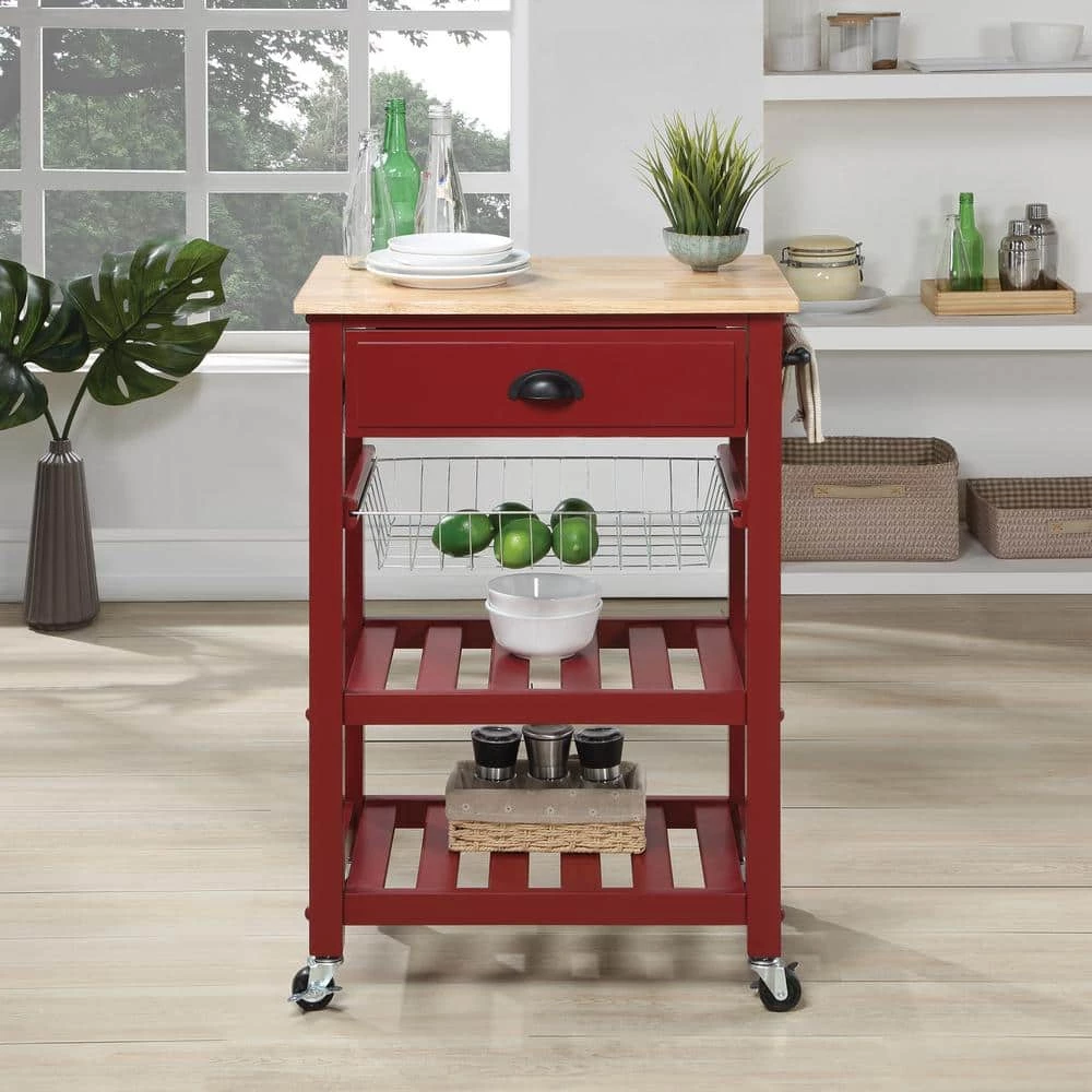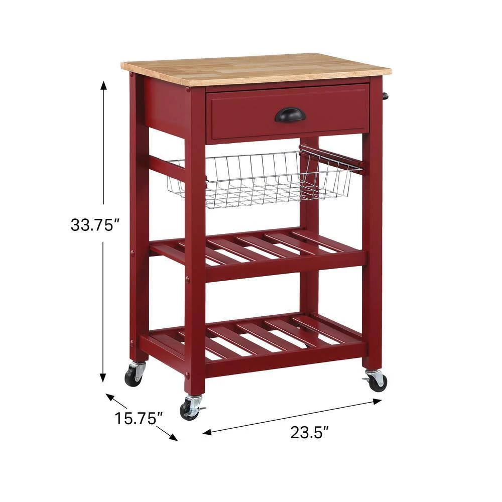 A flawless solution for space saving homes and apartment living, our Kitchen Cart with Wood Top, combines beauty and functionality. Its multifunctional design makes it perfect for food preparation, serving, and kitchen storage. Beautiful from every angle, it features a solid wood painted finish, contrasted with the clean lines of a durable wood food prep surface. A top drawer will hold all your cooking utensils, while the charming pull out basket will hold your fresh produce or kitchen linens. 2 slatted open shelves are ideal for large pot storage and display. The handy towel bar, heavy duty hardware and locking casters, provide long lasting appeal. A must have addition to any home, this charming kitchen cart is sure to be your new favorite place for both cooking and stowing away countertop clutter.