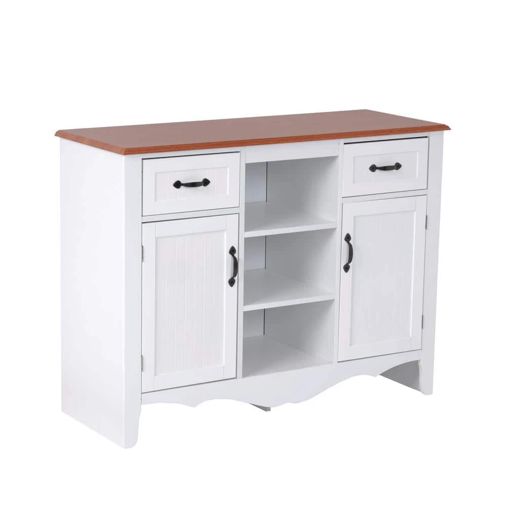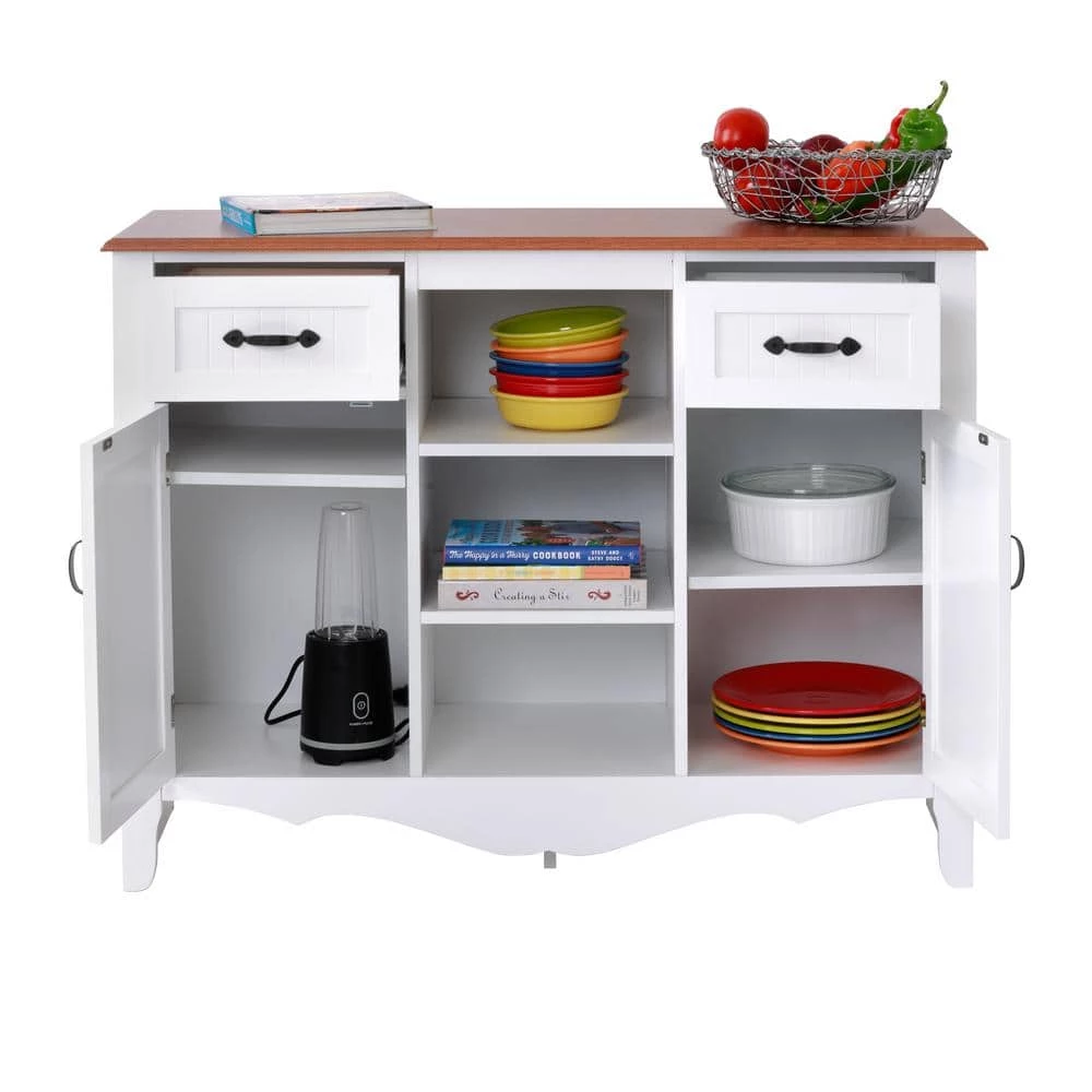 Multi-Functional cabinet utilizing 2 doors to conceal dishes, glassware, or table ware. In addition, 2 pull-out drawers maximize useful storage space. Ample open center space allows decorative items, or utilize the space for additional storage or your necessary kitchen or dining accessories. The warm pine laminated top adds a nice compliment to the crisp white painted doors and drawer fronts.