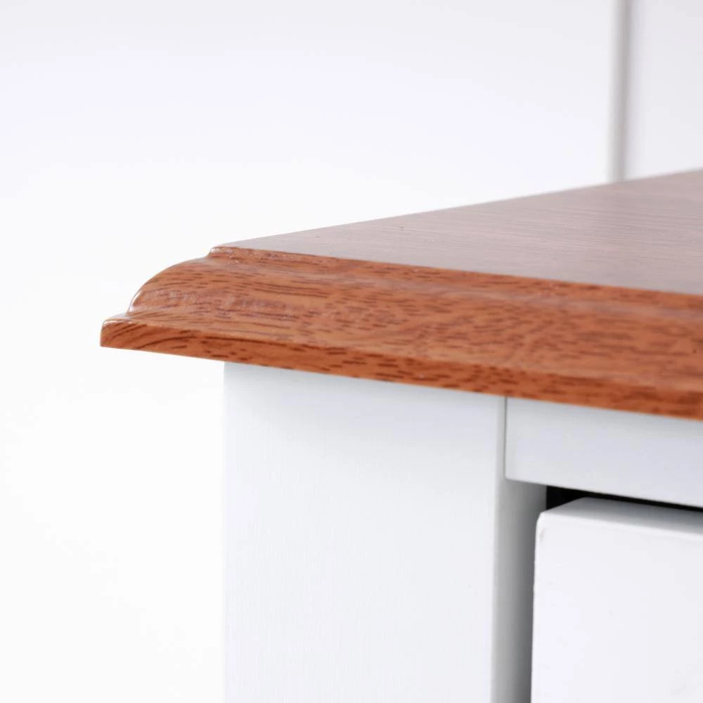- Warm pine laminated top offers a nice contrast to the all white antique style cabinet