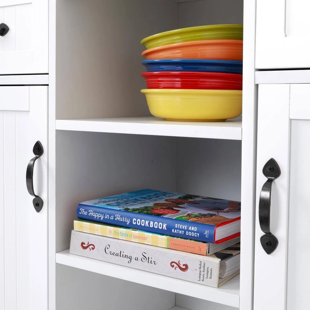 - 2-doors accompanied by 2 pull-out drawers maximize concealed storage for plates, glassware, or kitchenware
