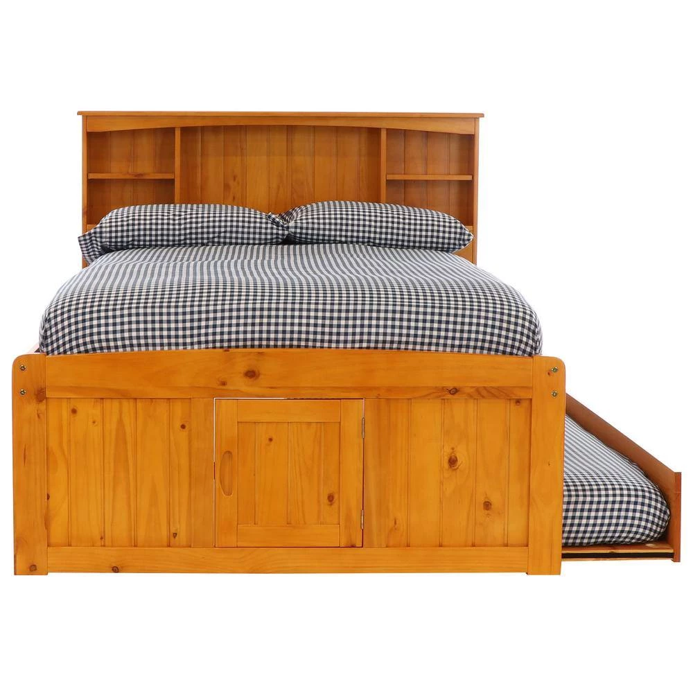 Add fashion and function to your child’s bedroom with this full size captains bookcase bed in a warm honey finish. The ready-to-assemble unit provides loads of storage with 3-sturdy drawers and twin trundle that can be placed on either side of the bed and under bed storage accessible from either end of the bed. The drawers feature metal drawer guides and attractive routed pulls. Quality and solid wood construction makes this captains bed a great purchase.