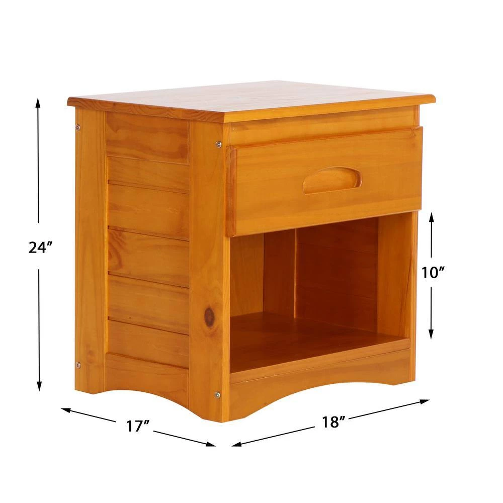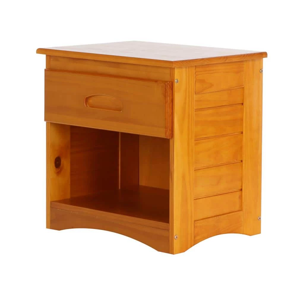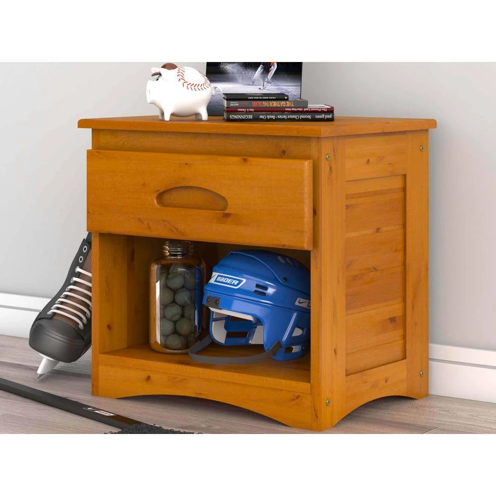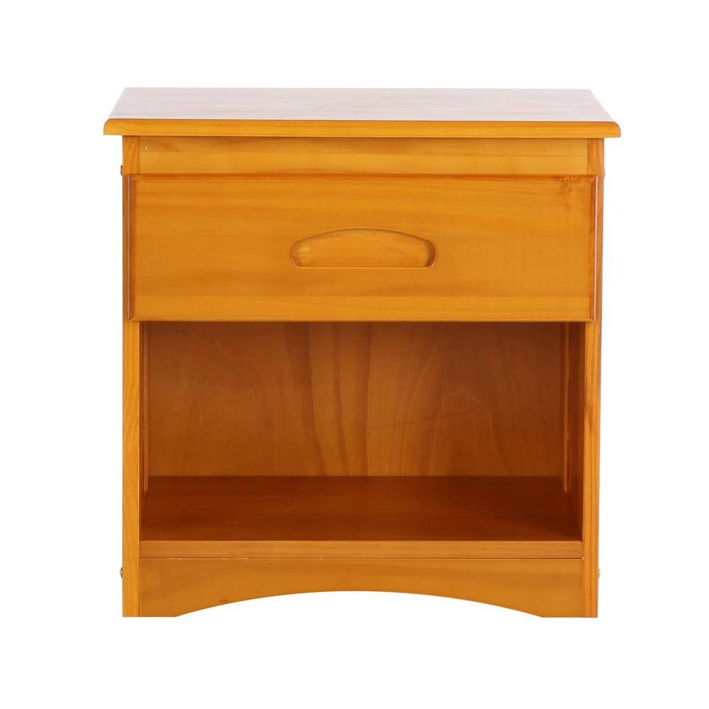 This solid wood one drawer night stand with unique framed detail on sides and beveled top is a great complement to any bedroom. The drawer is on sturdy Euro style guides and has an attractive carved finger pull. One sturdy drawer on roller drawer guides.