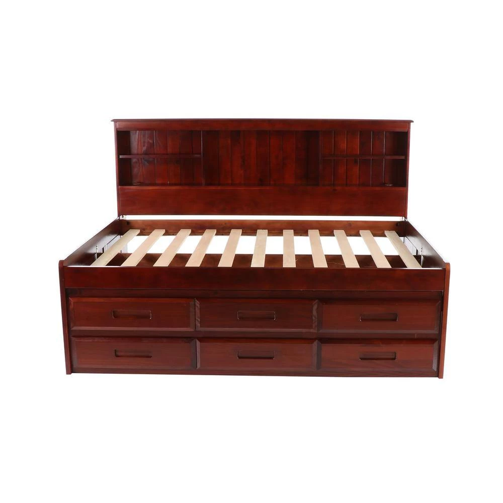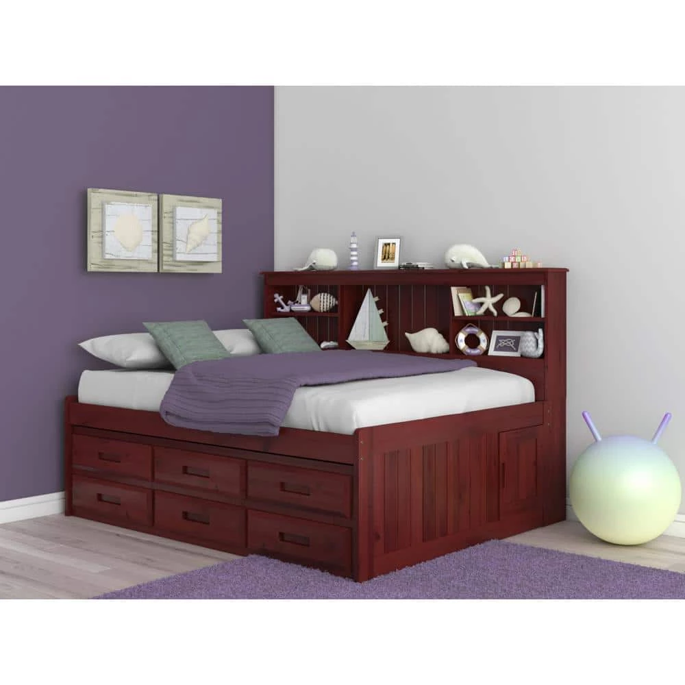 Add class to your child’s bedroom with this full size bookcase headboard daybed in a rich merlot finish. The ready-to-assemble unit provides loads of storage with the 6-drawer pedestal and underbed storage accessible from either end of the bed. Quality and solid wood construction makes this bookcase daybed a great purchase.