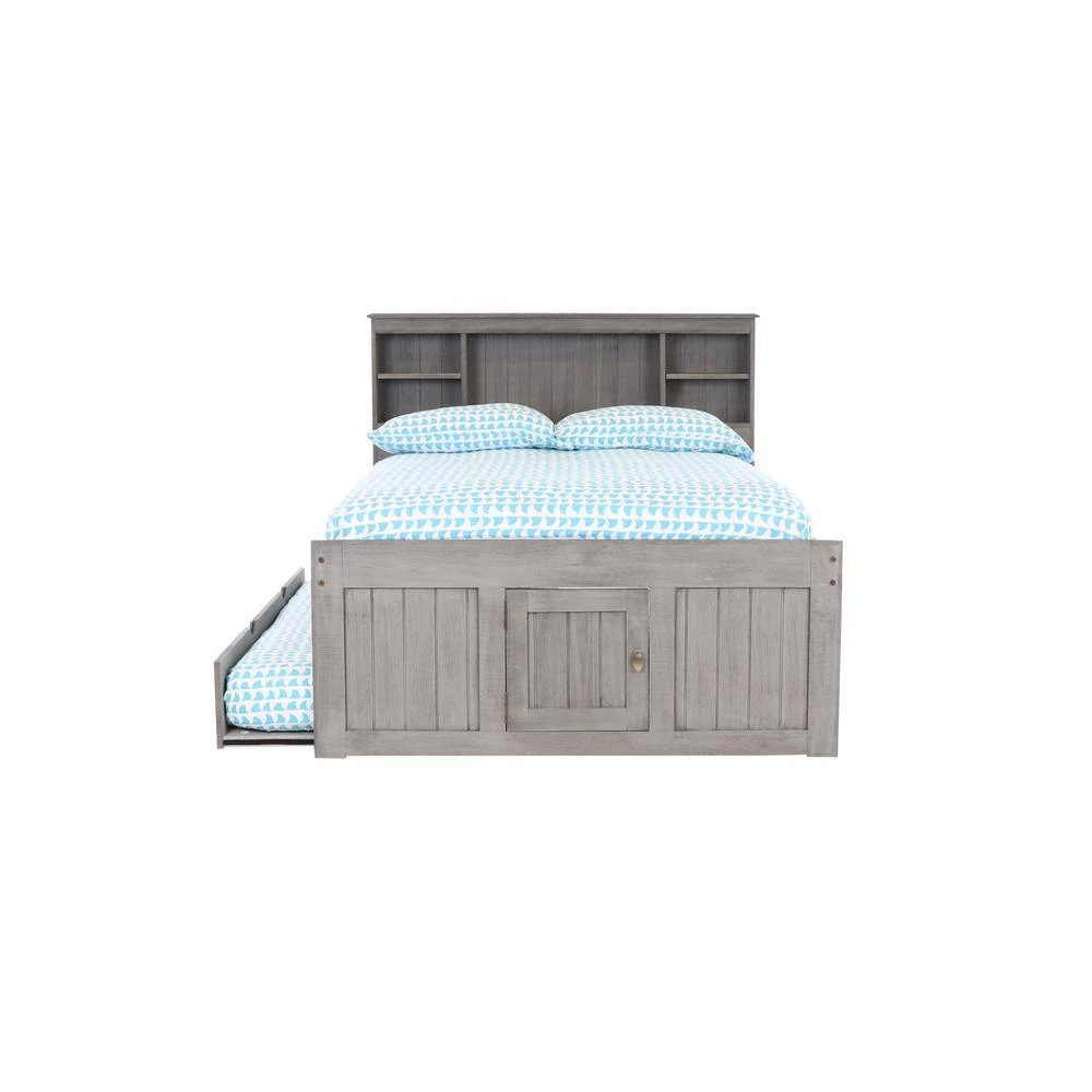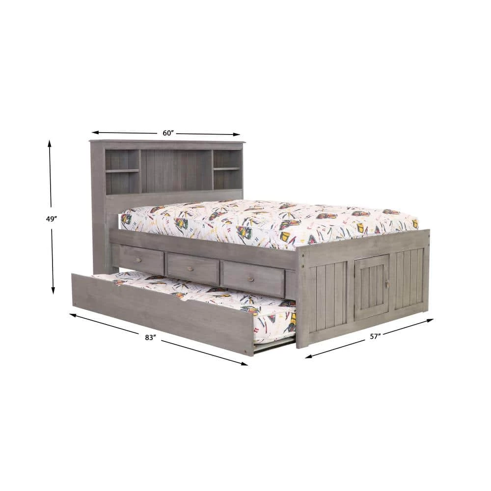 Add fashion and function to your child’s bedroom with this full size captains bookcase bed in a rich charcoal gray finish. The ready-to-assemble unit provides loads of storage with 3-sturdy drawers and twin trundle that can be placed on either side of the bed and under bed storage accessible from either end of the bed. The drawers feature metal drawer guides and attractive nickel finished pulls. Quality and solid wood construction makes this captains bed a great purchase.