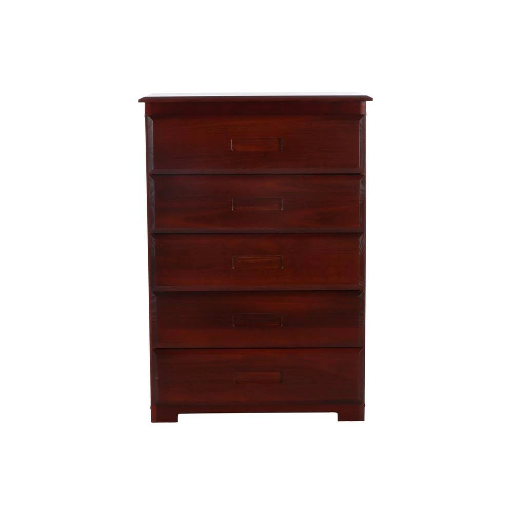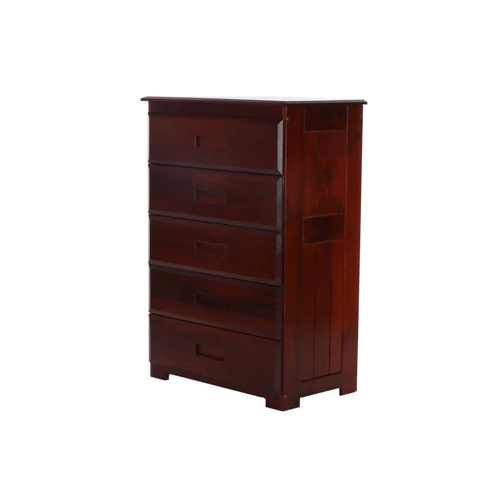 This sturdily constructed solid pine 5-drawer chest finish will give you years of service. The item ships ready to be assembled. Features unique, framed side panels and attractive carved finger pulls on the drawers.