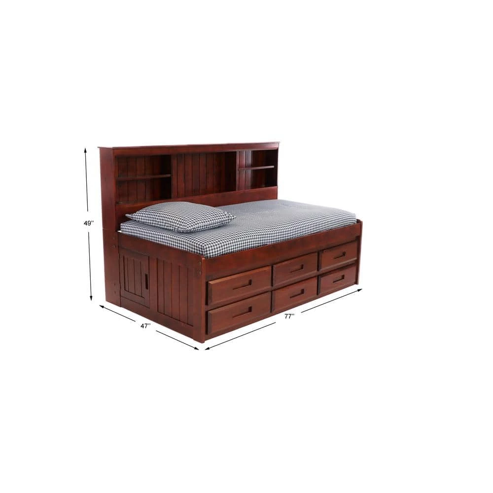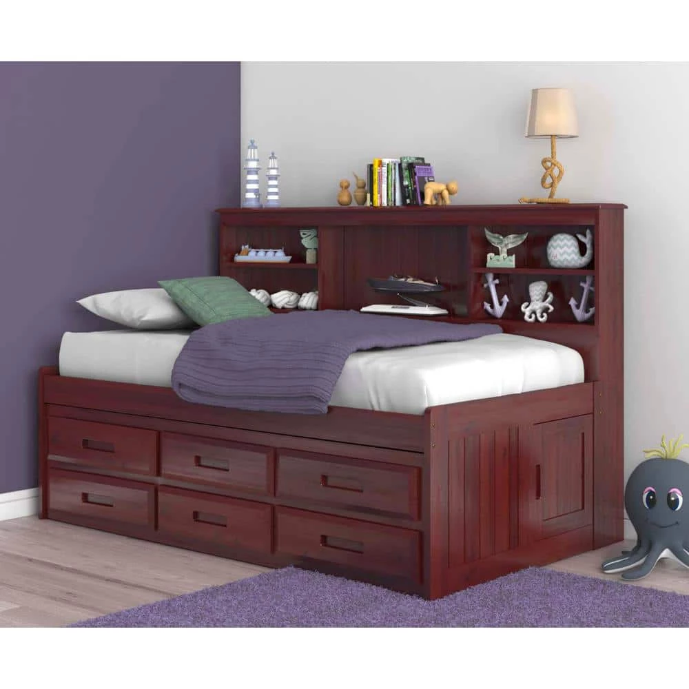 Add class to your child’s bedroom with this twin size bookcase headboard daybed in a rich merlot finish! The ready-to-assemble unit provides loads of storage with the six-drawer pedestal and underbed storage accessible from either end of the bed. Quality and solid wood construction makes this bookcase daybed a great purchase.