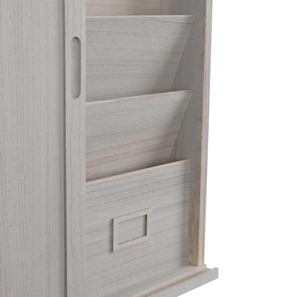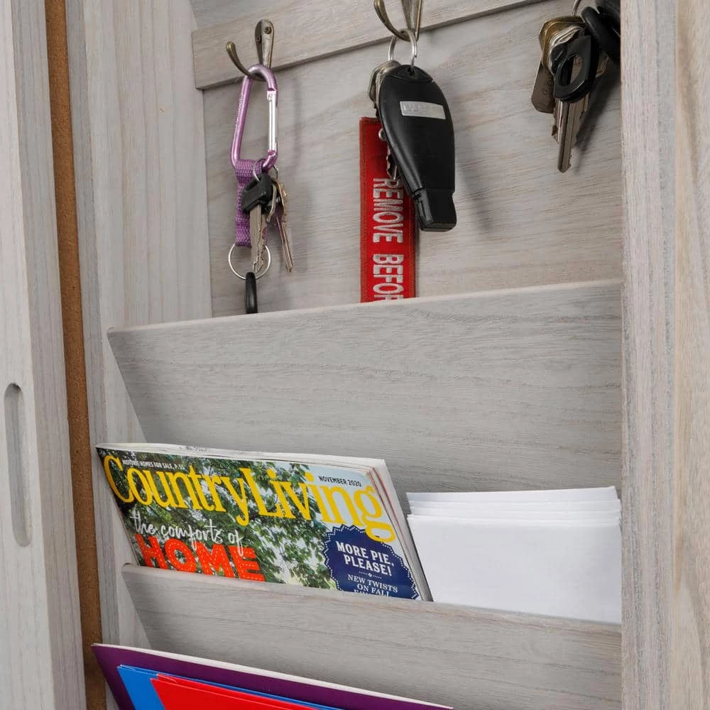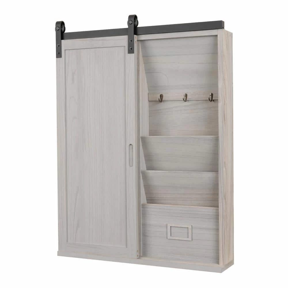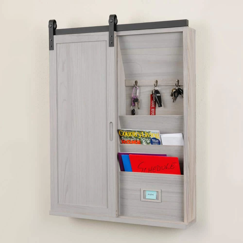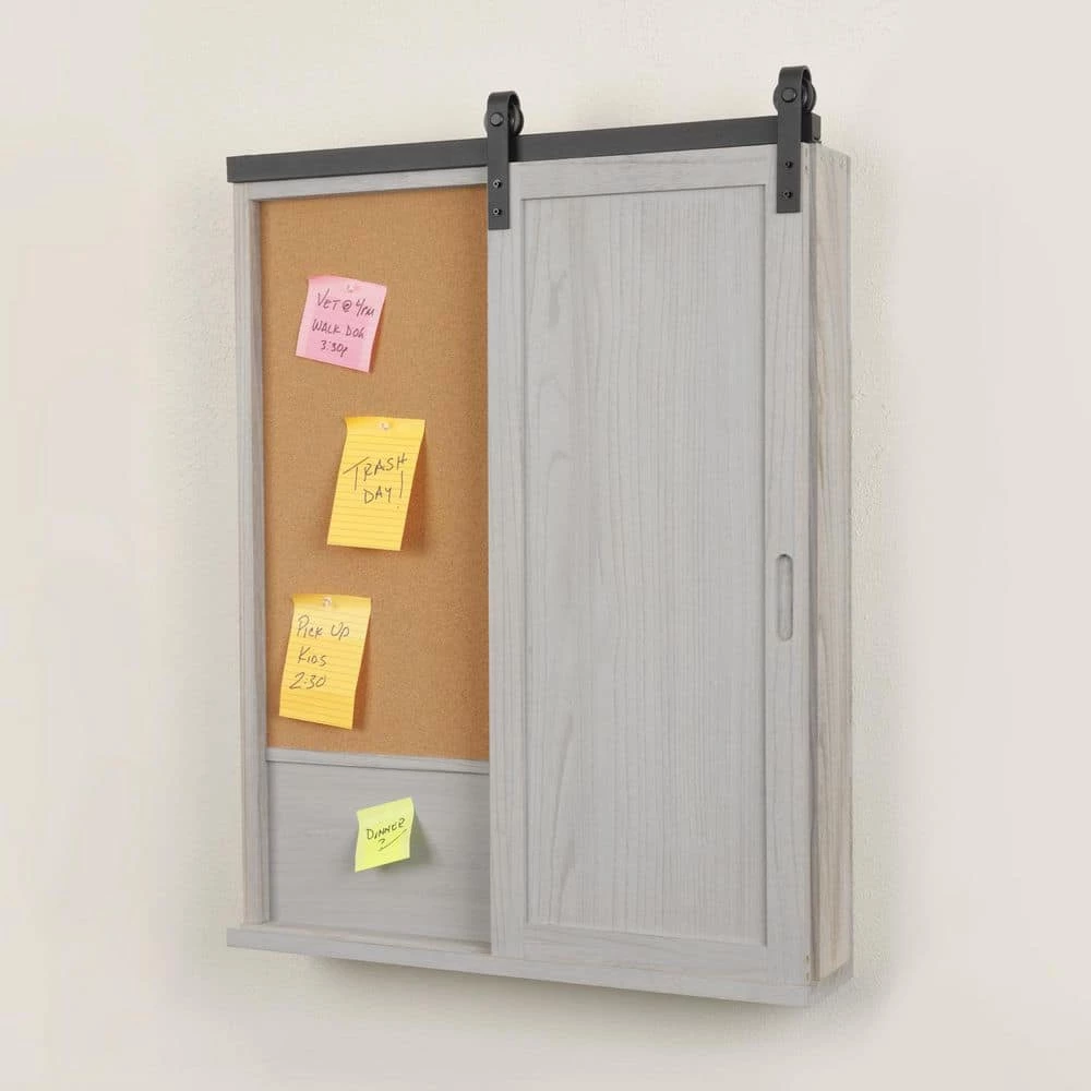 Add organization to your kitchen, living area, or office with our hanging organizer with sliding barn door feature. The cabinet is finished in a distressed gray look to match any decor. Organizer slots hold magazines, notebooks, tablets, etc… while 3 strategically placed hooks allow you to hang keys or lanyards to help keep you organized. Slide the barn door to the right and it reveals a cork board to tack recipes, receipts, reminders, or notes of motivation to keep your family on top of the daily activities.