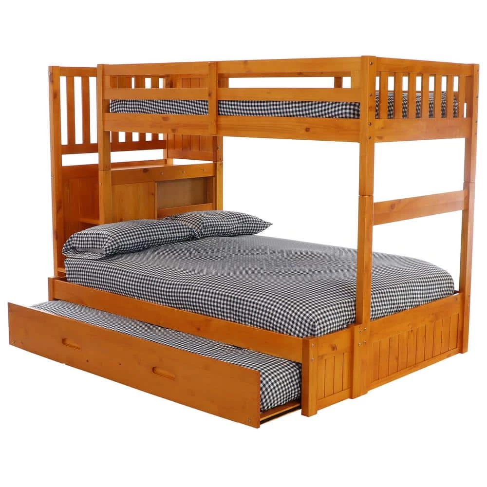 Add style to your children’s bedroom with this twin over full staircase bunk bed in a warm honey finish. The ready-to-assemble unit features a built-in, four-drawer chest and reversible staircase, magazine rack, and a twin sized trundle unit on sturdy casters. The stair treads are 17.25 in. wide for a safe climb to the upper bunk. Quality, solid-wood construction makes this bunk bed a great buy.