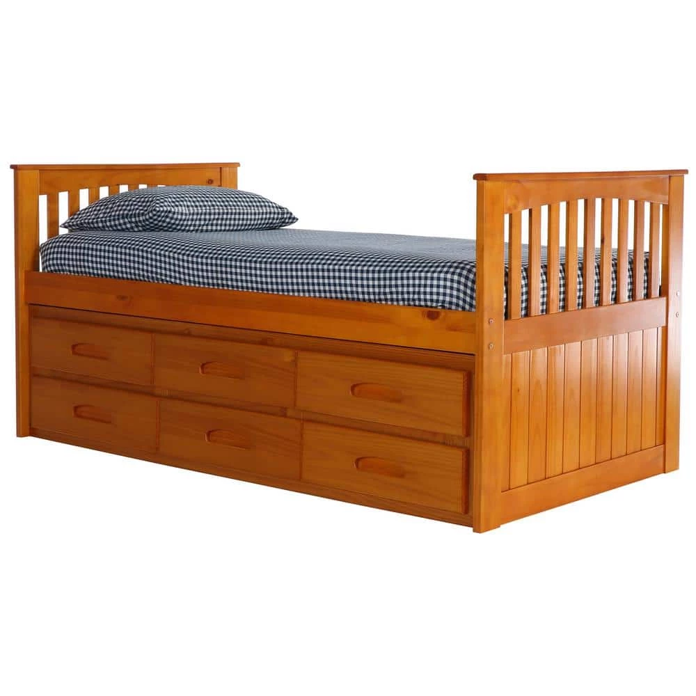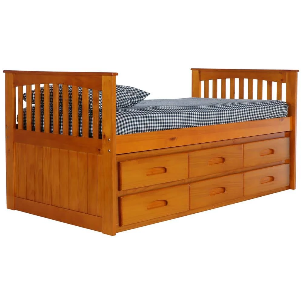 This twin size rake bed in a warm honey finish provides plenty of storage and sleeping area while taking up very little space. The bed includes 12-drawers with 6 on either side of the bed and have sturdy metal guides. Quality and solid wood construction make this ready-to-assemble bed a great purchase.