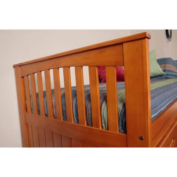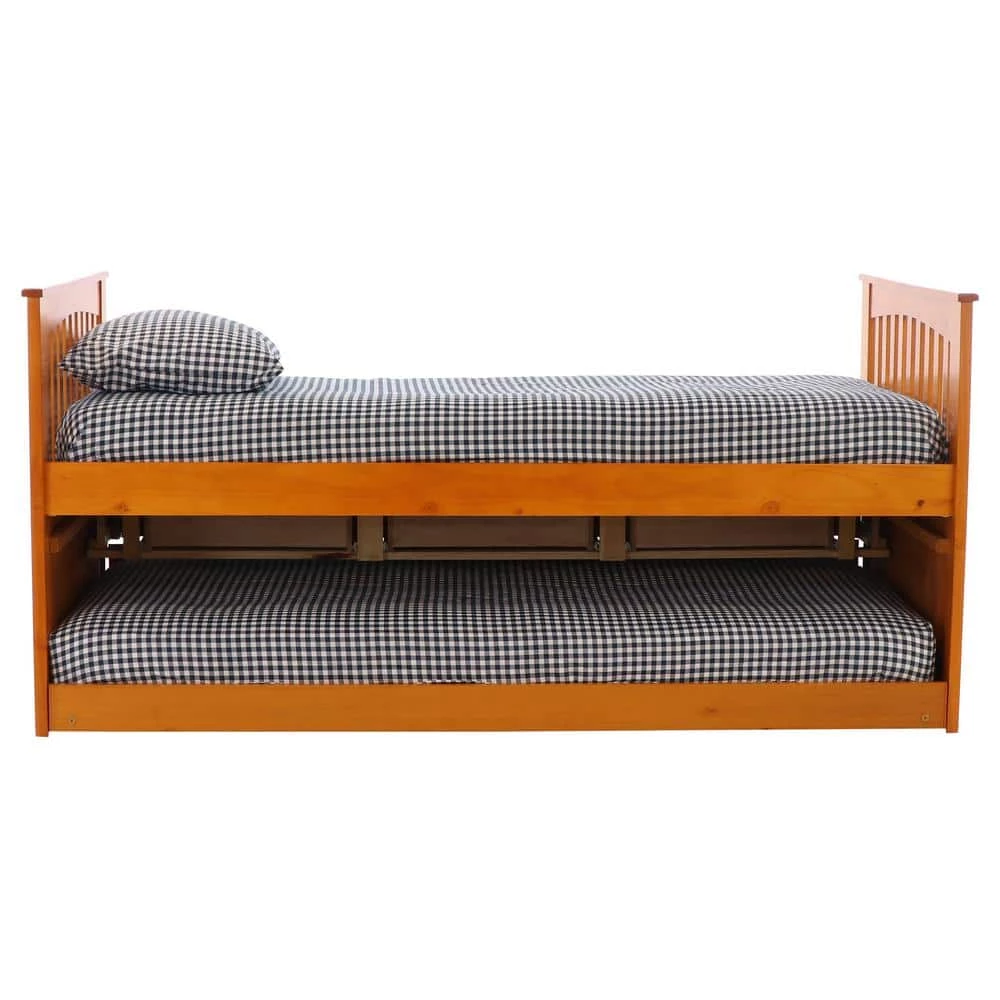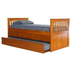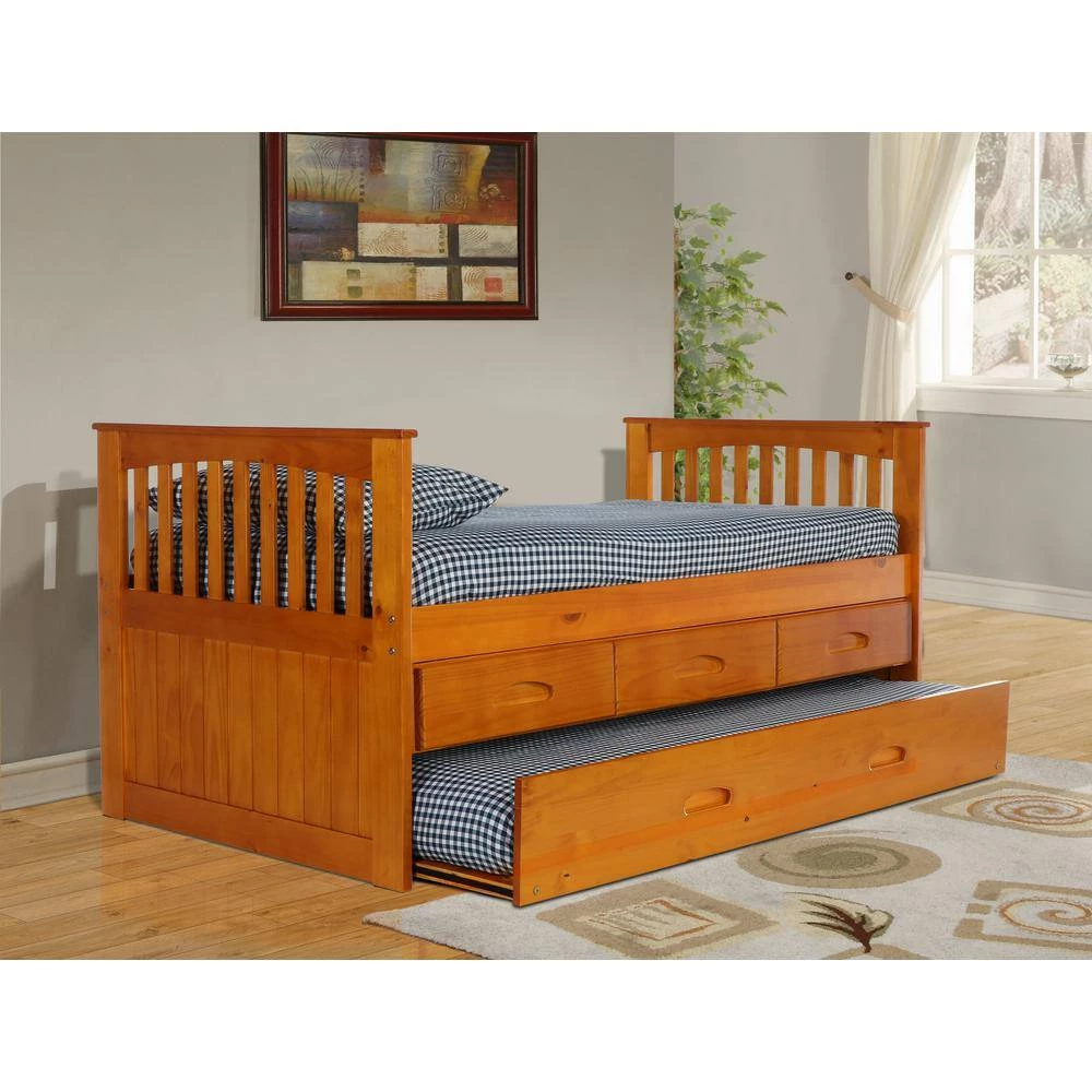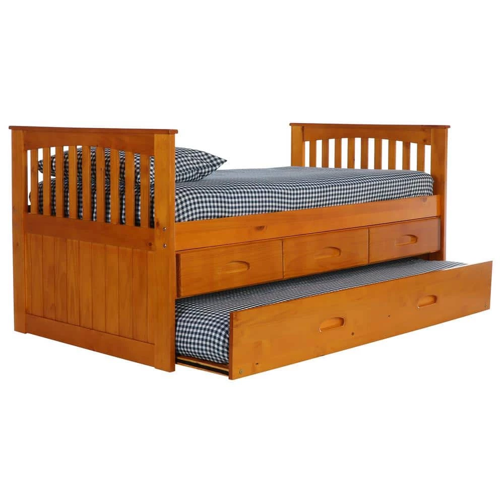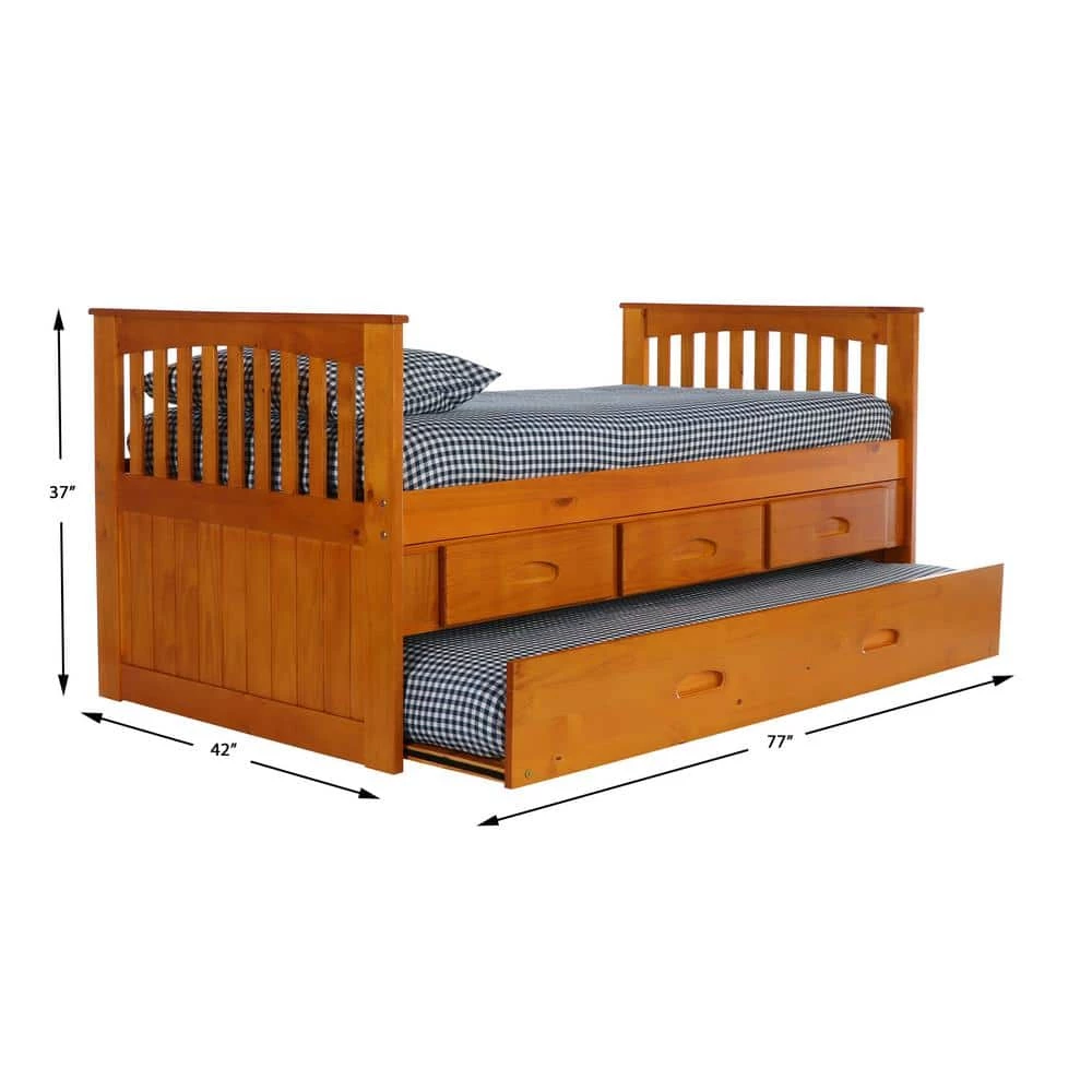 This twin size rake bed in a warm honey finish provides plenty of storage and sleeping area while taking up very little space. The bed includes 3-drawers for storage and a trundle unit for an additional sleeping area. Quality and solid wood construction make this ready-to-assemble bed a great purchase.